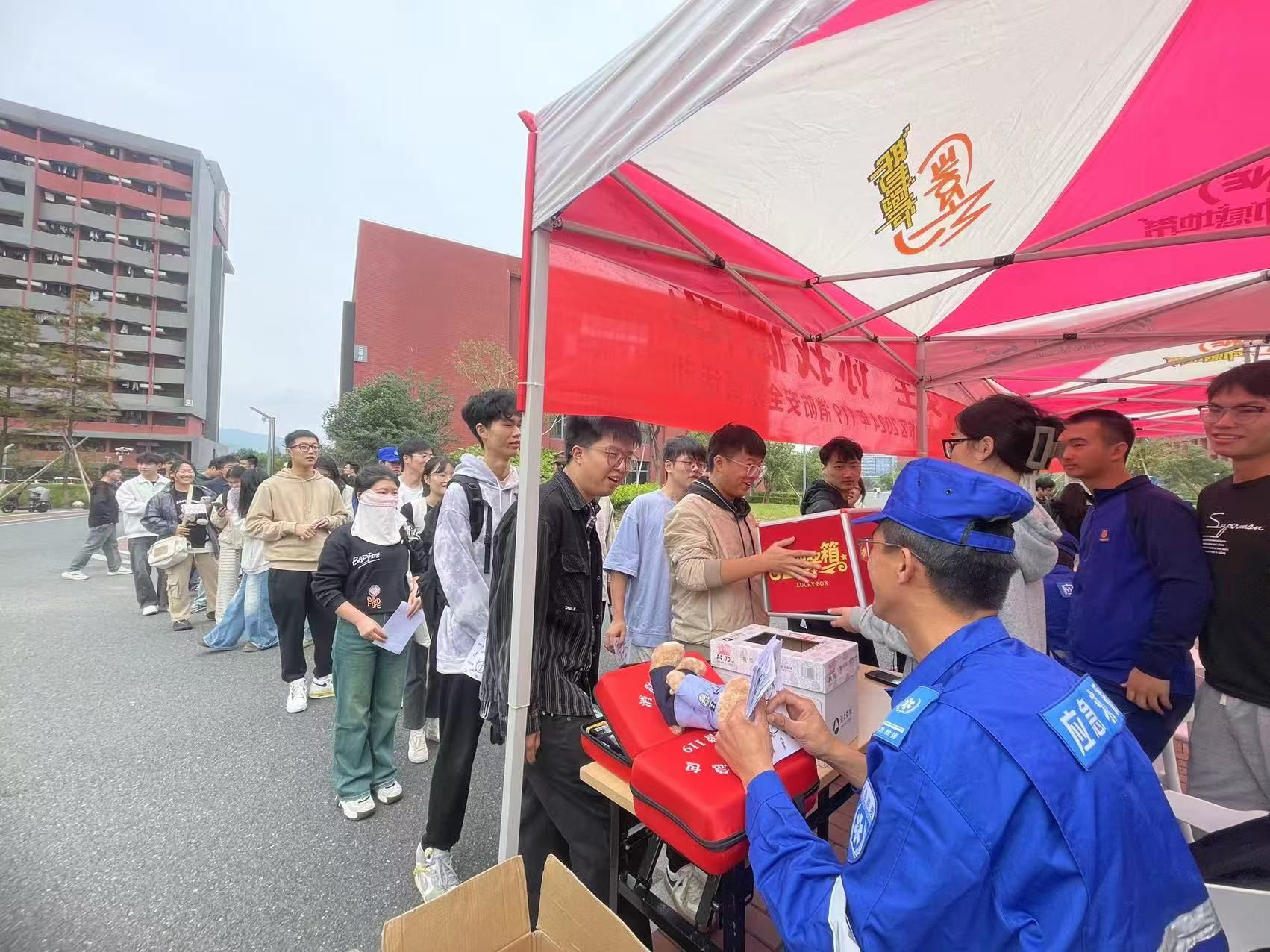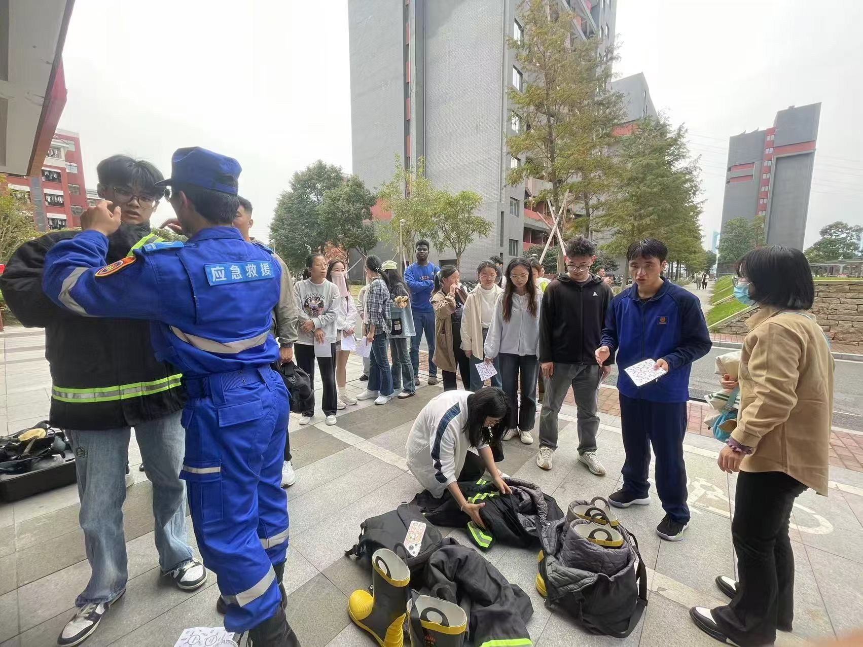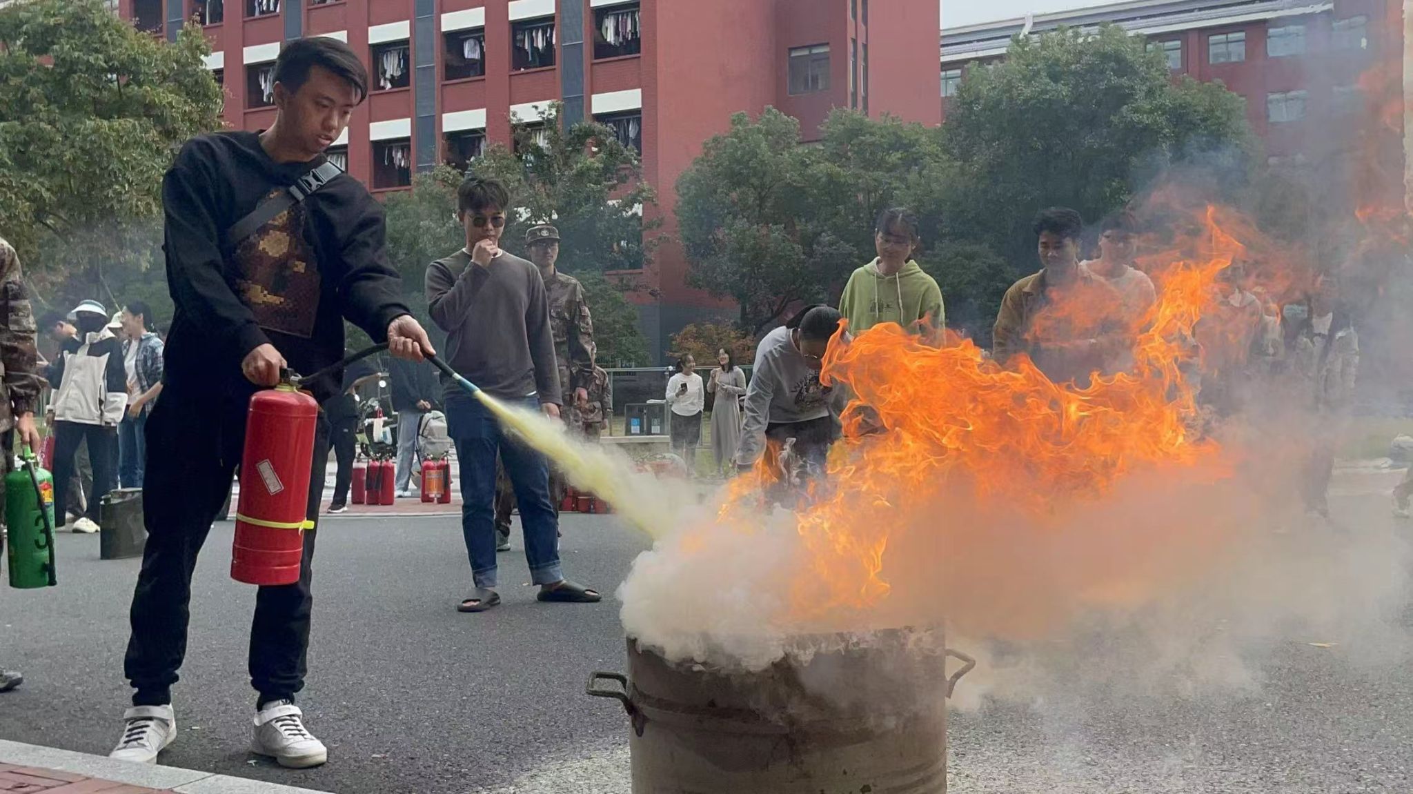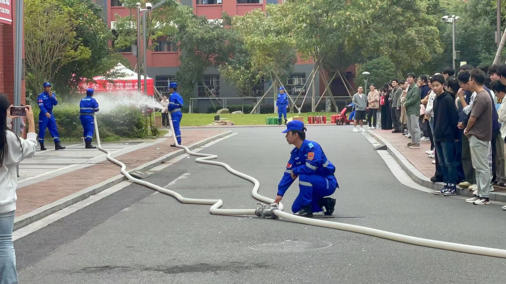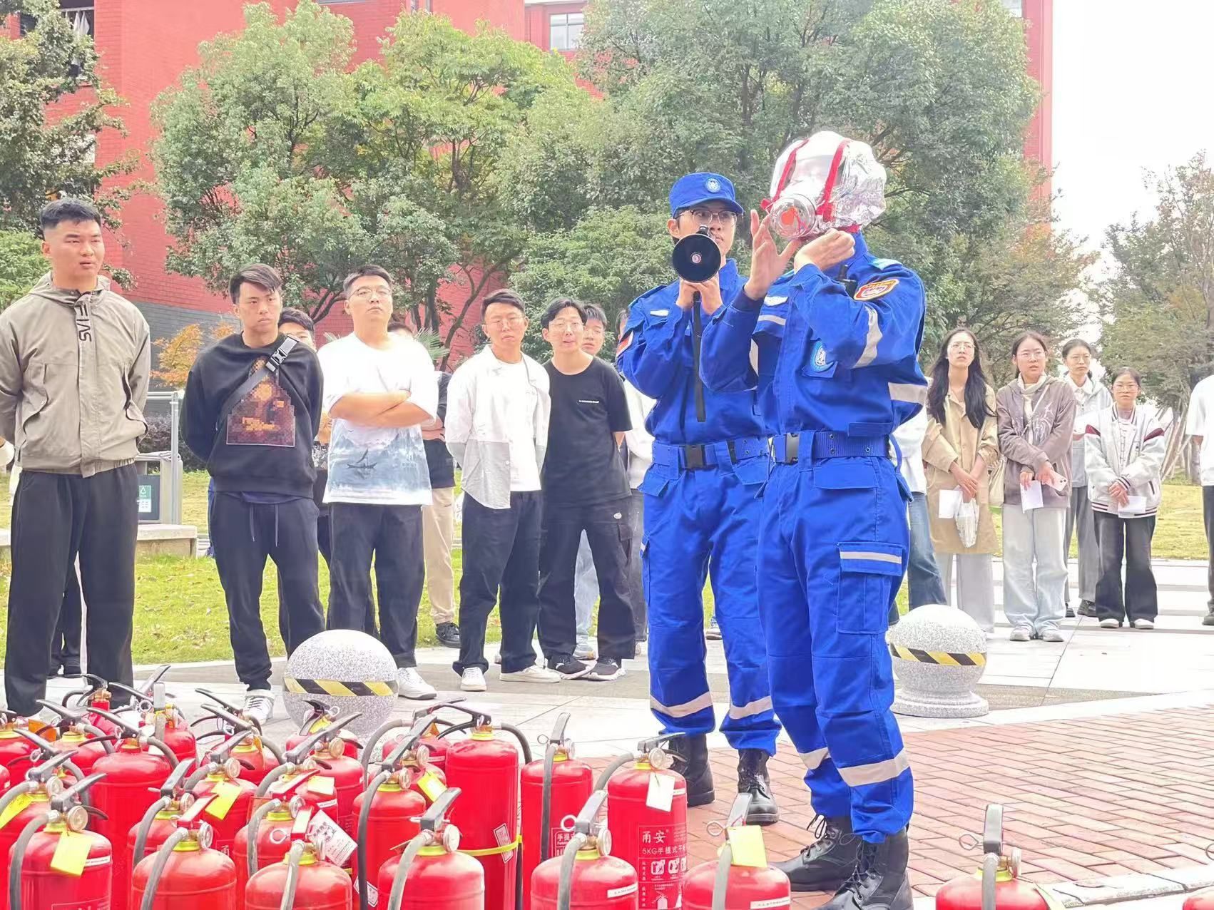 本次演练活动主题是“消防在行动,安全伴我行”,由梅山校区学生志愿消防队承办,包括消防演练和消防体验两个环节。