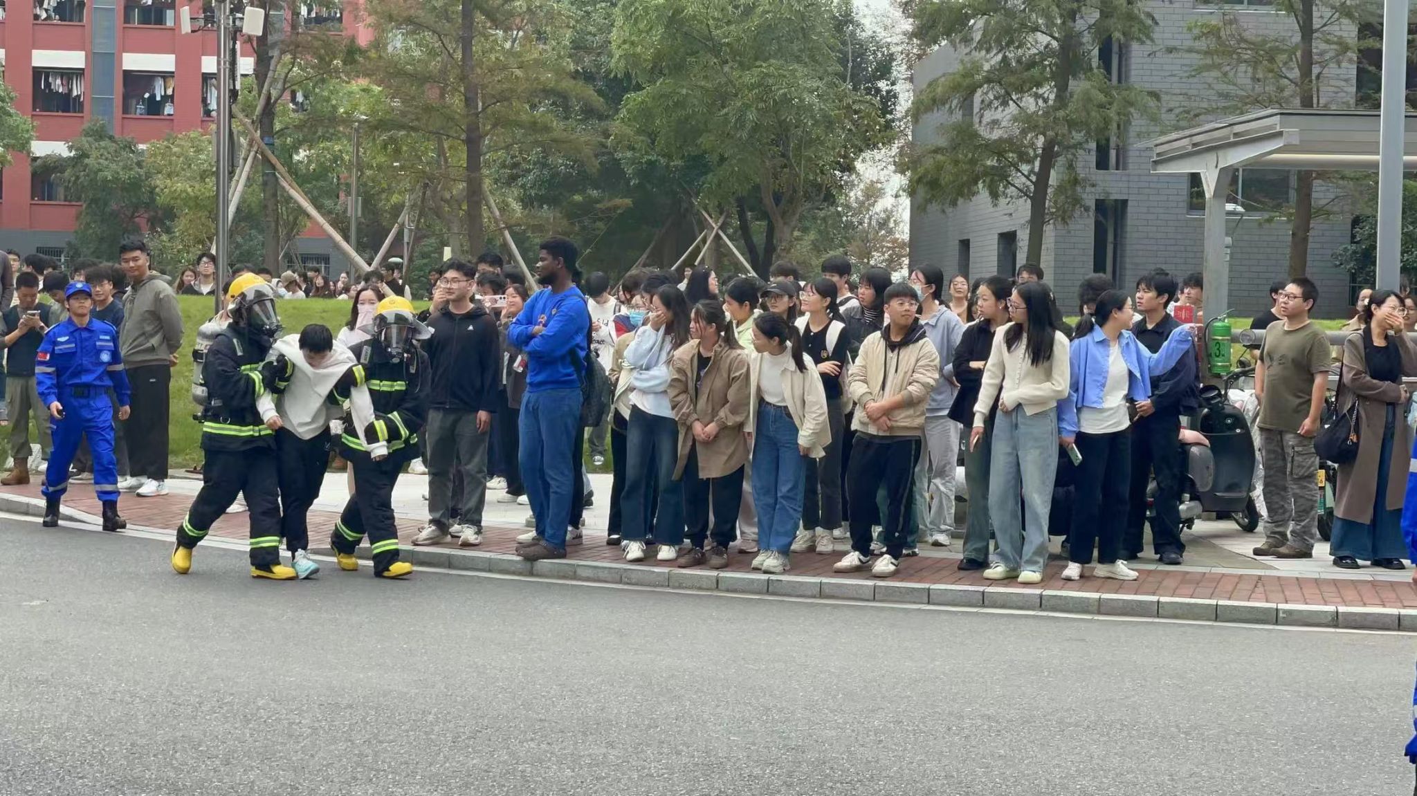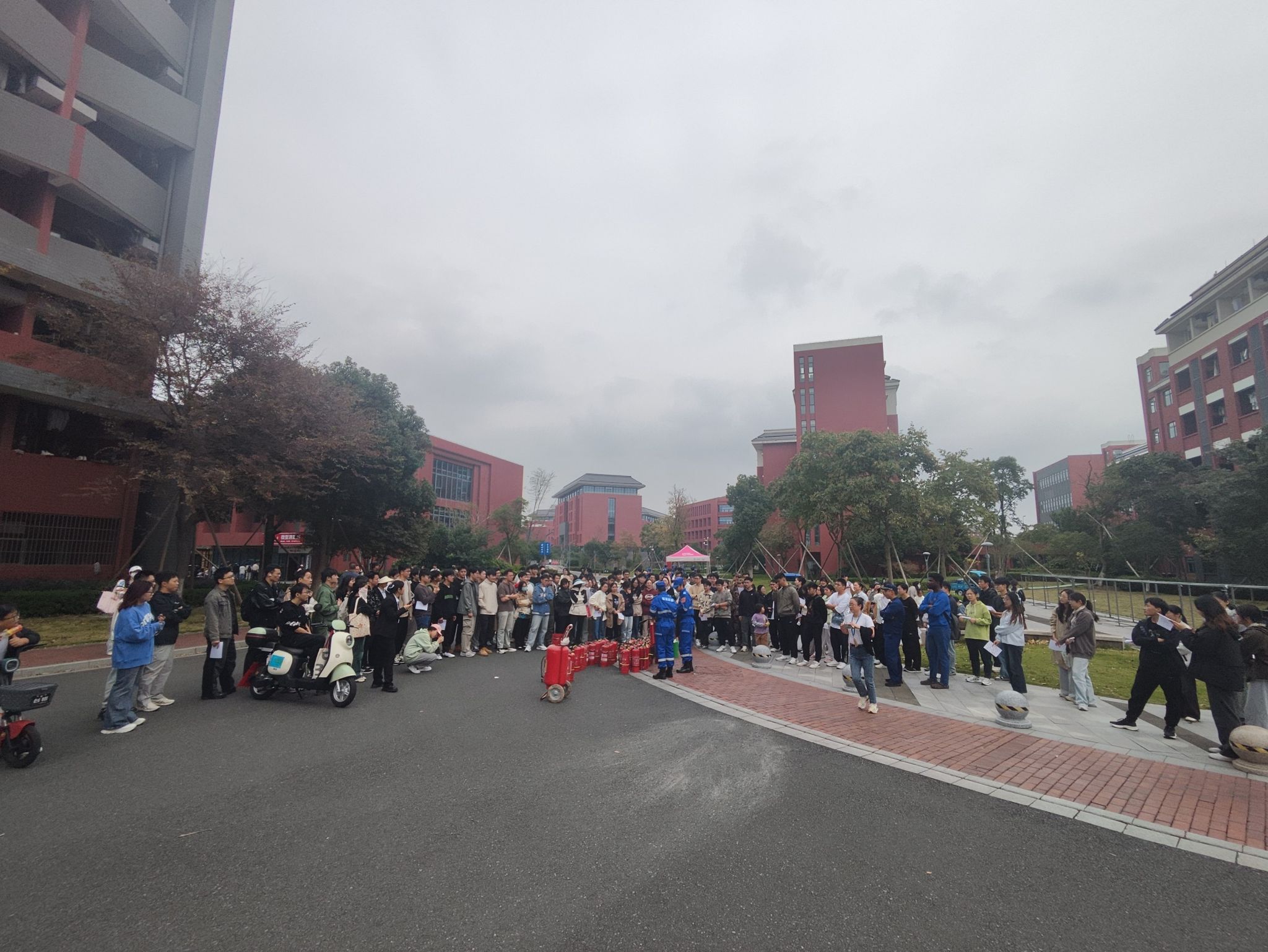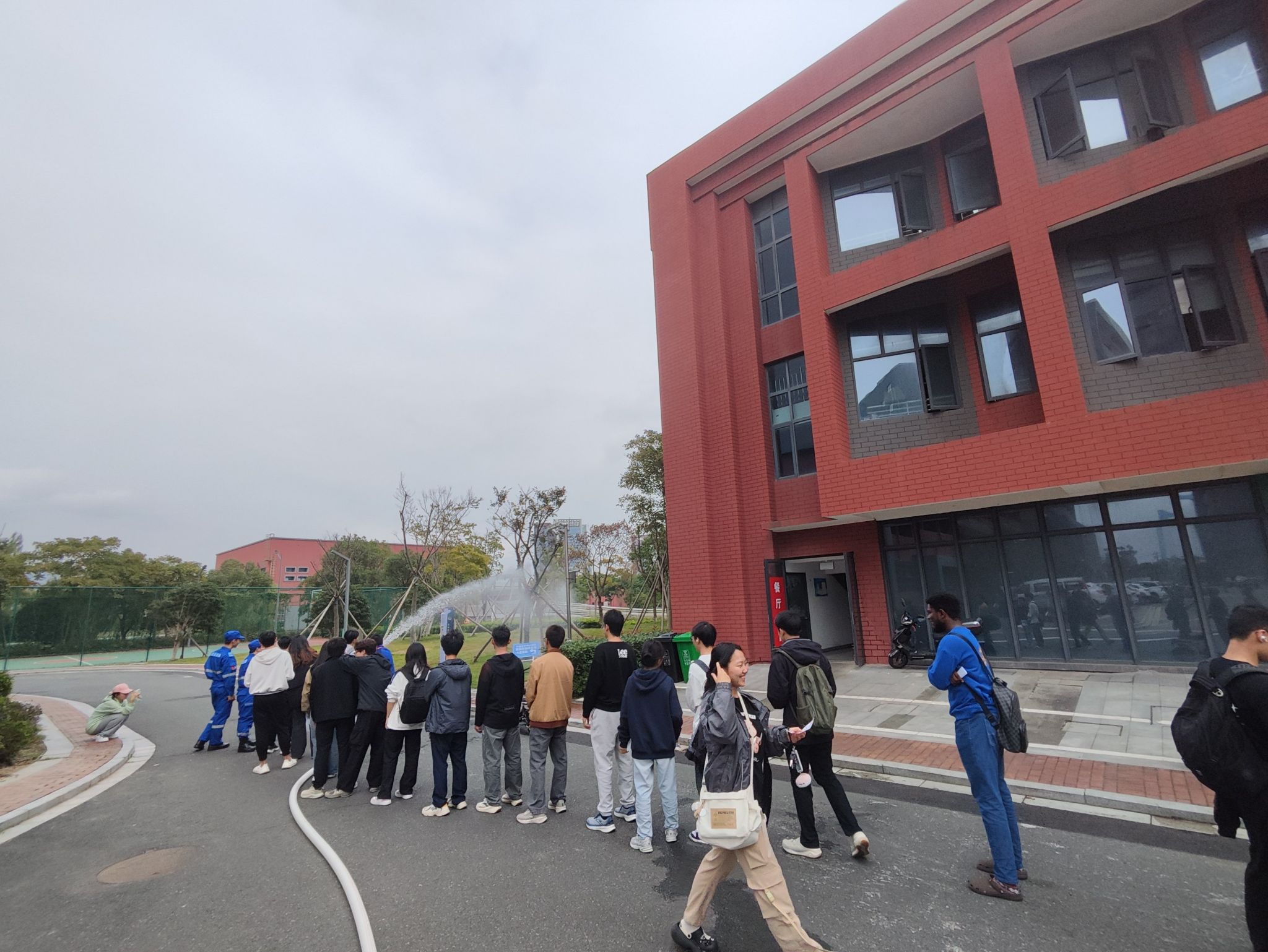 中午12:30演练活动开始,在梅山校区二餐厅附近演练了发现火警、报警、人员疏散与救援、灭火全过程。消防队训练有素,演习过程有条不紊。