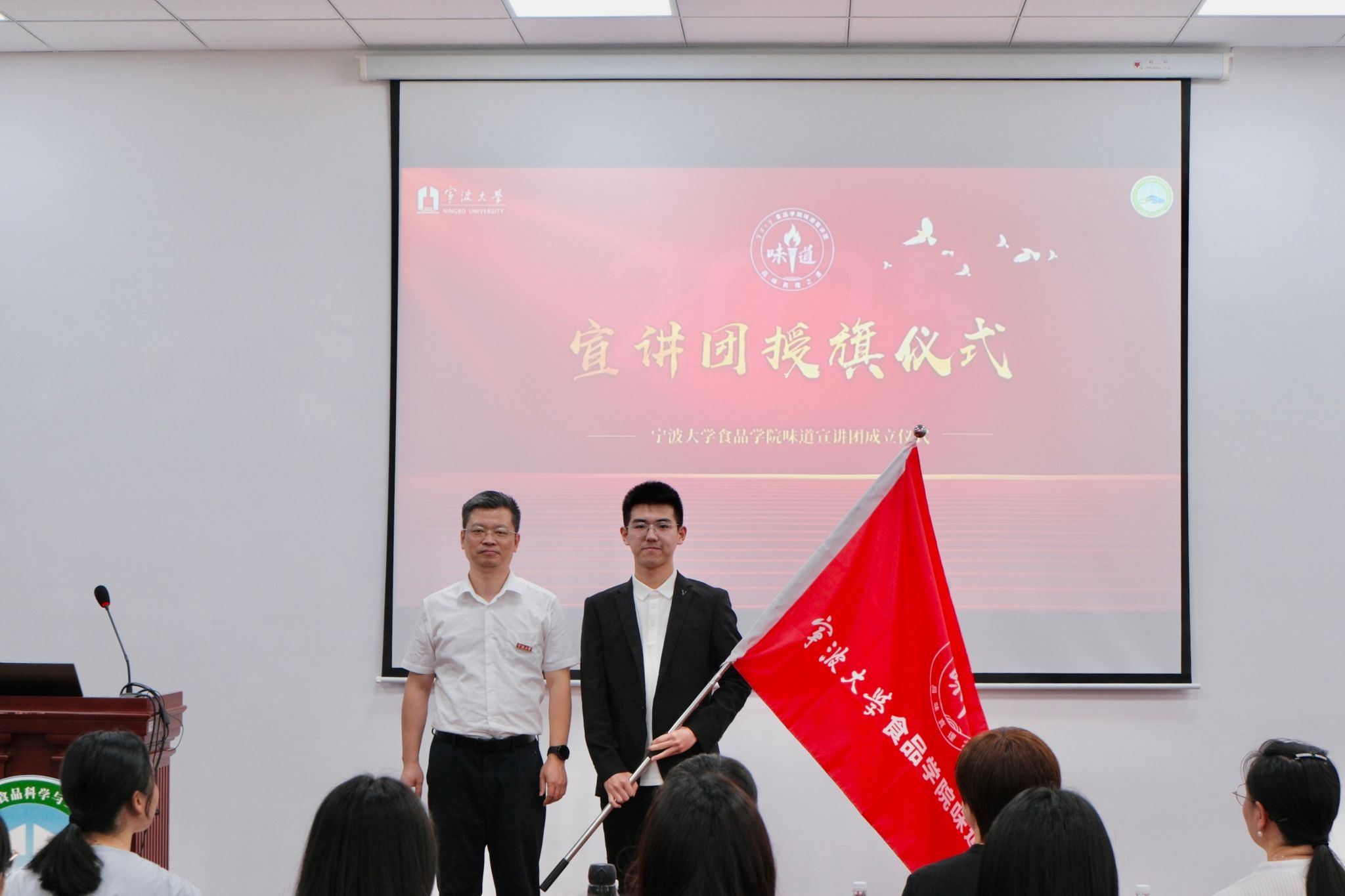 “味道” 宣讲团成立仪式在竺银康楼 120 室隆重举行。学院党委书记龚文杰、党委副书记张维、学术副院长许凤、学院关工委副主任吴祖芳等领导及教师莅临现场,共同见证这一重要时刻。
