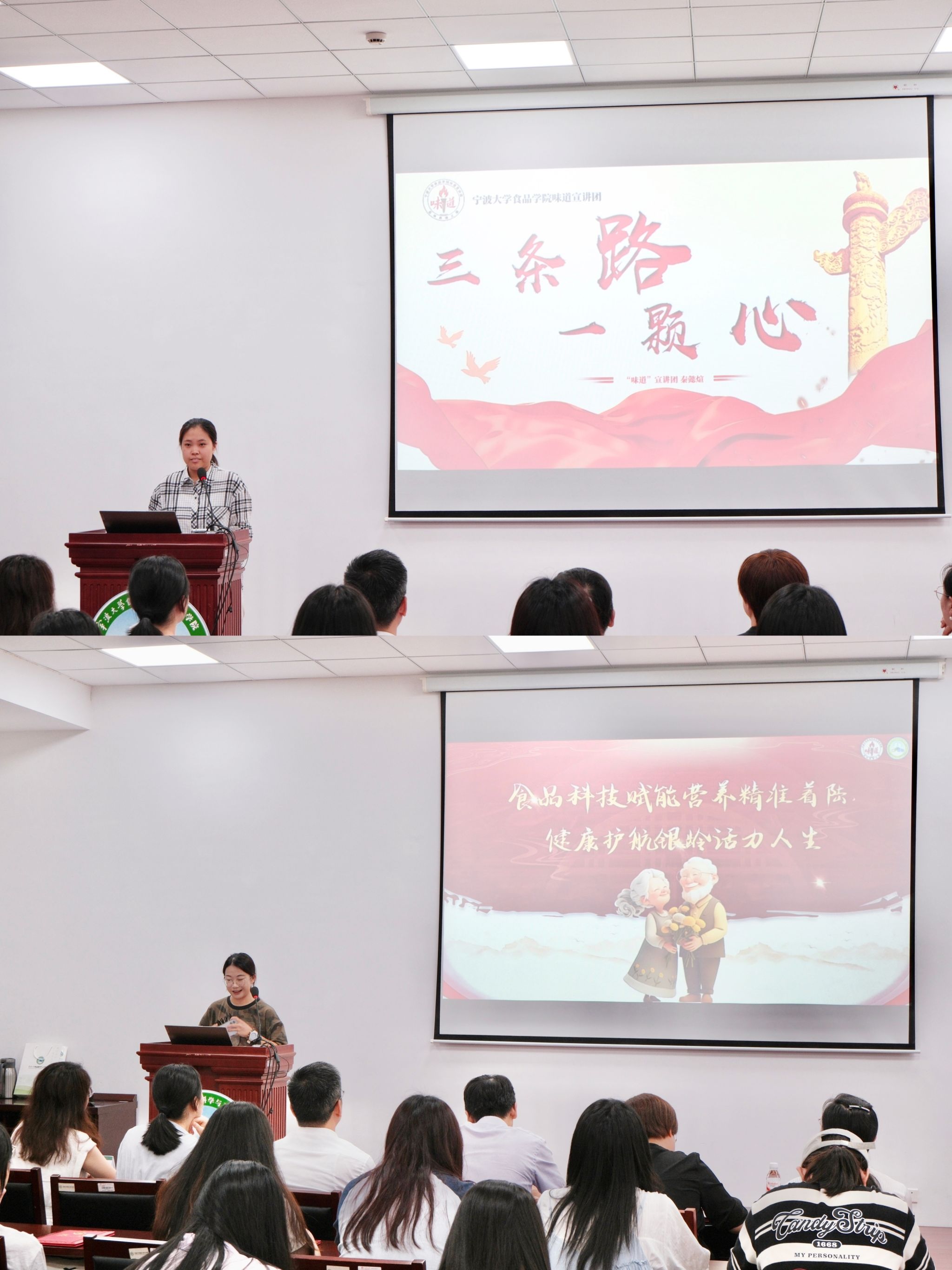 在微党课展示环节,两位同学围绕 “食品与健康” 主题开展理论宣讲,展现出扎实的专业素养与宣讲能力。导师们结合宣讲表现,提出了具有针对性的评价与建议,为宣讲团后续工作的开展奠定了坚实基础。