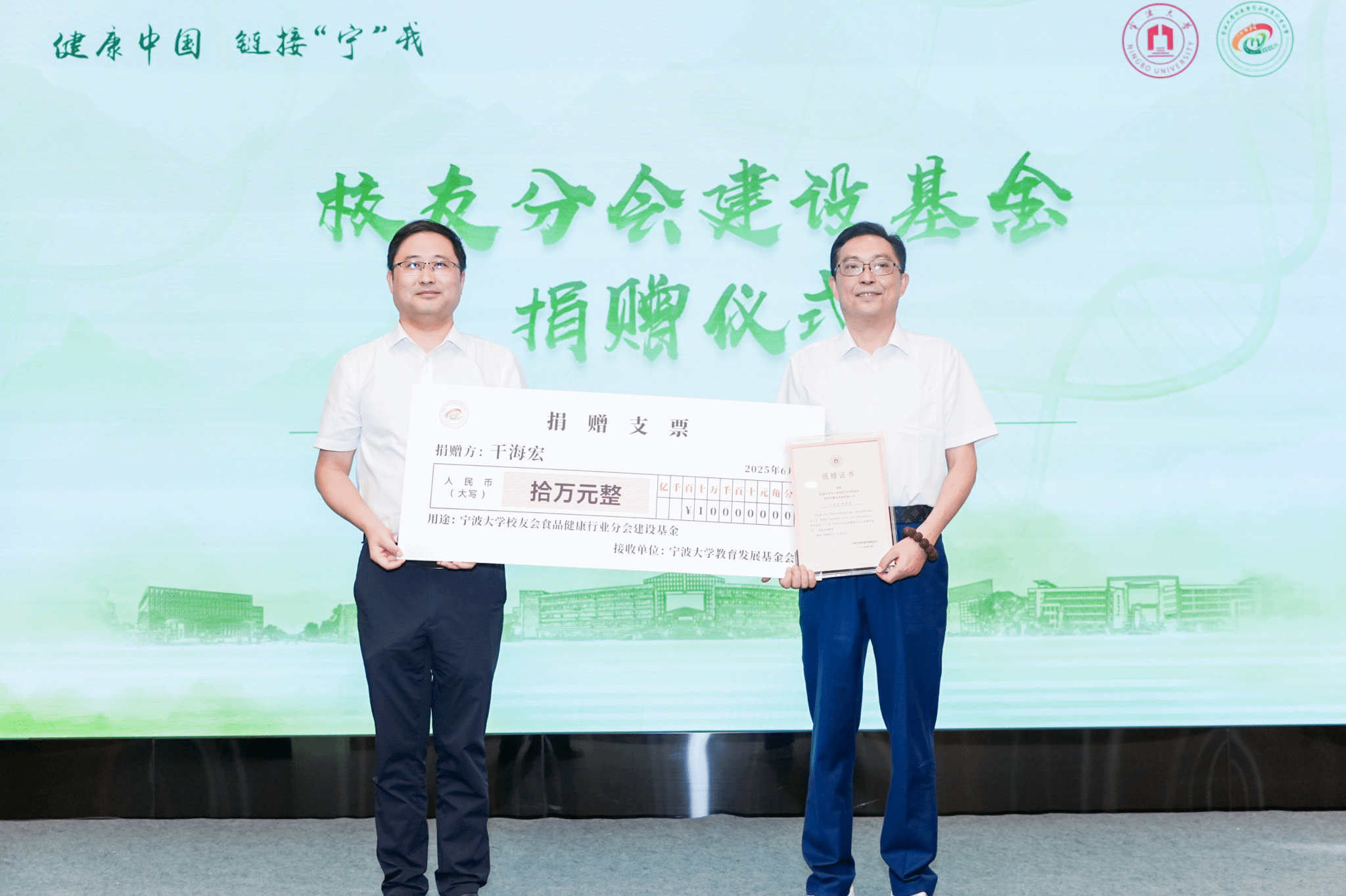 大会举行了校友分会建设基金捐赠仪式。分会设立“建设基金”,以保障各项活动高质量开展和助力食品领域人才培养。干海宏会长首捐10万元用于分会筹办,在他的带领下,施海富、刘勤茂校友也分别捐赠3万元和2万元。