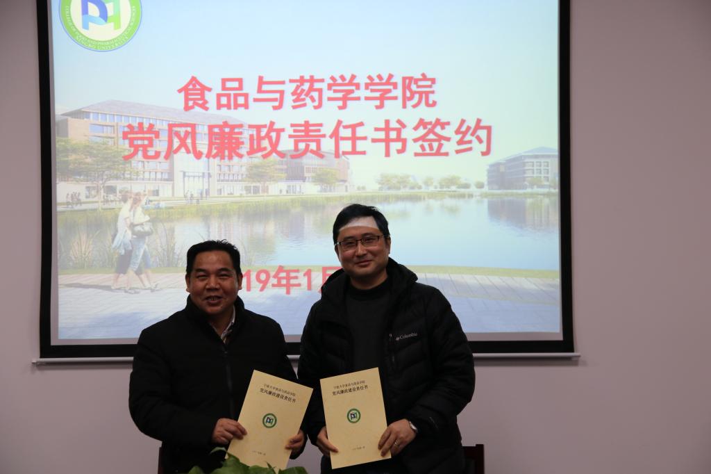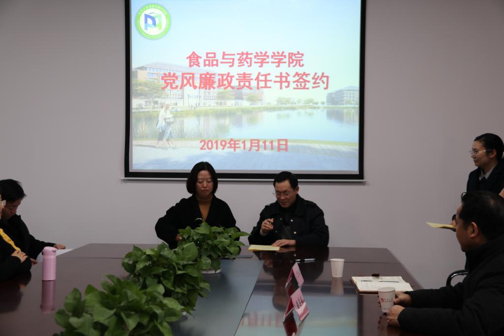 各分管领导就国家基金申报、期末考风考纪、学科建设、博士点申报、国际化示范学院建设等相关事宜作了通报,党委书记陶娟会上传达了学校纪委《关于做好2019年元旦春节、寒假期间纠正“四风”有关工作的通知》,强调了2019年春节、寒假期间要巩固拓展落实中央八项规定精神成果,深入推进作风建设持续,强化监督执纪问责、紧盯纠正“四风”工作提出具体工作要求,扎实落实上级指示精神。会上,各分管领导与责任对象分别签署了《食品与药学学院党风廉政建设责任书》,切实将党风廉政建设落实到人,抓实到位。