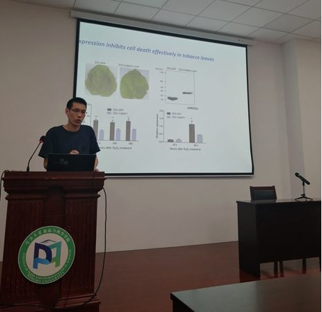 曹博士介绍了干旱胁迫下,调控葡萄细胞凋亡的几个关键基因在拟南芥和烟草上的转化,以及基因功能验证。并在报告过程中指出,目前这个项目的局限性和亟需解决的问题。报告结束后,曹博士耐心回答了与会师生的提问,分享了实验中要注意的一些问题。