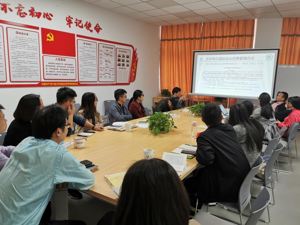学院党委书记陶娟首先传达了余建森书记《全面从严治党背景下的高校党风廉政建设工作》的专题党课精神,强调了重点关注高校易发多发的几大重点领域:违反政治纪律和政治规矩;干部人事、职称;中央八项规定精神;经费使用管理(尤其是科研经费);师德师风问题;招标采购等,并且要注重加强学习,注意防范。学院党政办主任、院纪委委员邓方对学校公务接待、劳务费等相关文件做了详细解读。