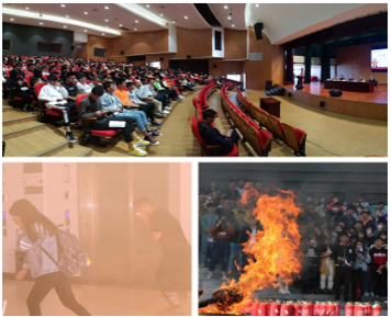 13时10分活动开始,梅山校区管理委员会主任张国良致辞,保卫处副处长周曙明介绍演练程序,随后春晓消防中队陈彦州隆指导员作消防知识讲座。陈指导员从事消防工作多年,处理过各种灾害事故。他呼吁大家珍爱生命,用真实案例向数百名现场的师生生动讲解了火灾防范和逃生自救技术。他说,遇到突发事件,首要是确保自己存活下来,两分靠运气,三分靠别人,五分靠自己,所以必须学会逃生,学会处置突发情况。遇到火灾,用湿毛巾掩口鼻,弯腰低身,扶墙走。如果房间出口被堵,用床单窗帘结绳从窗户逃生。