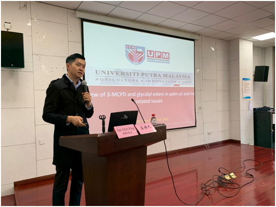 师生做了题为“Overview of 3-MCPD and glycidyl esters in palm oil and industry related issues”的学术报告。聆听报告的主要为食药学院教师、研究生及本科生。邵兴锋副院长主持了报告会。