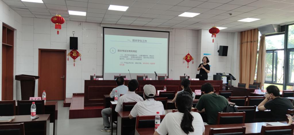 院领导班子成员结合期末工作,分别对科研、学科和研究生教育、本科教学、国际化合作、学生工作、安全稳定等工作情况进行了通报和部署。潘道东重点强调了安全问题,陶娟重点强调了期末考风考纪、毕业生就业、防诈骗等,同时就文明城市创建的相关工作及安全稳定工作做了安排部署。会议最后,陶娟对全院教师进行廉洁自律教育宣传,同时,将正在开展的校内巡察工作要求进行了传达。