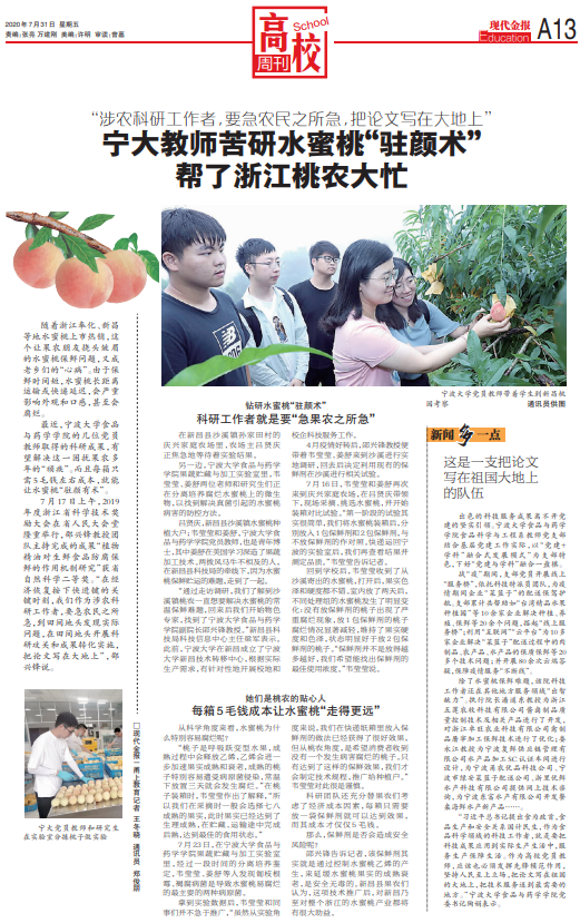 食品科学与工程系教师党支部的党员骨干教师深入果农一线,运用所取得的科研成果,有望帮助解决这一困扰果农多年的“顽疾”,而且每箱只需 5 毛钱左右成本,就能让水蜜桃“驻颜有术”。出色的科研服务离不开党建的坚实引领,该教师党支部结合基层党建工作实际,以“党建+学科”融合式 发展模式为支部特色,下好“党建与学科”融合一盘棋。