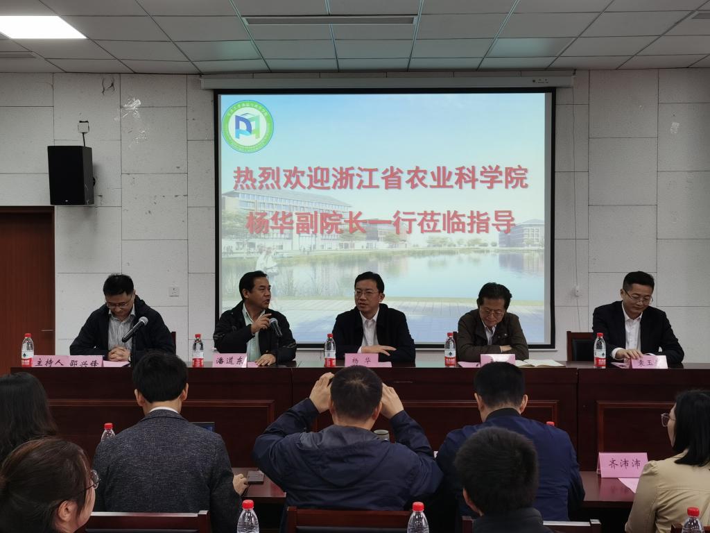 10月23日上午,浙江省农业科学院党委委员、副院长杨华,浙江省农业科学院农产品质量安全与营养研究所所长王强,浙江省农业科学院农产品质量安全与营养研究所副所长袁玉伟等一行来院交流座谈。会议由邵兴锋副院长主持,潘道东院长出席座谈。