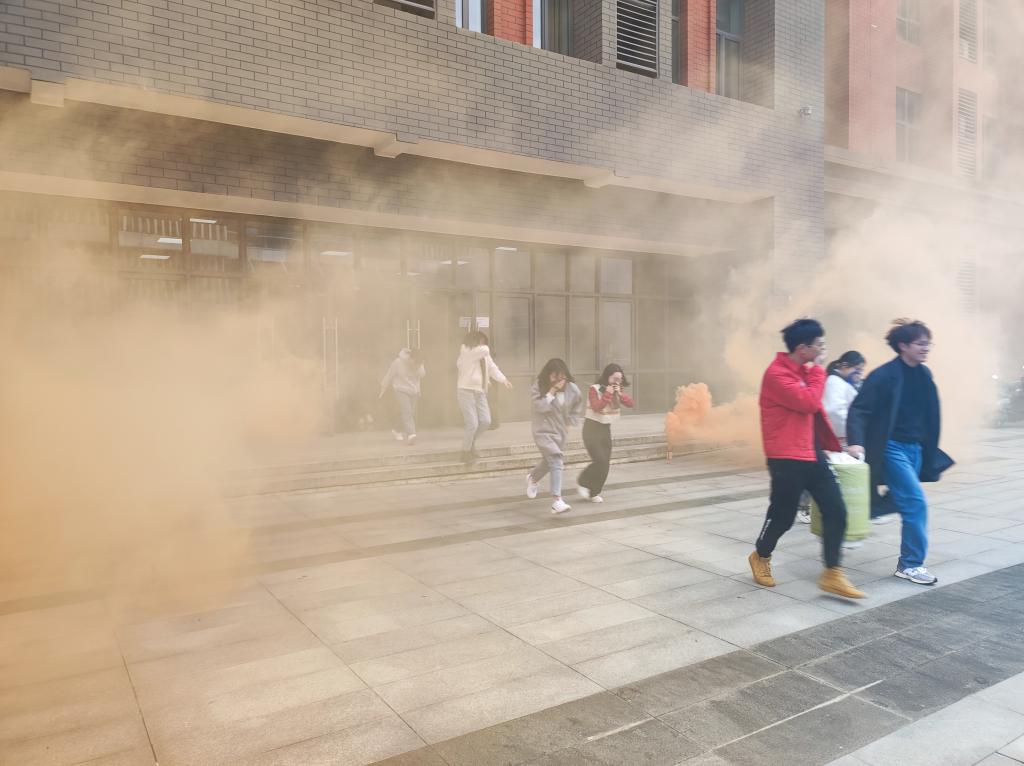 这次演练包括疏散演练和灭火演练两个部分。13:55分,演练正式开始,国际楼某处突发火情,安全演练人员按下消防报警按钮,国际楼各楼层响起消防疏散警报。在总指挥的安排下,安全防护组、灭火行动组、疏散救援组、通讯联络组同时展开行动。安全防护组立刻关闭电源总闸;疏散救援组督促师生们以湿毛巾掩住口鼻,迅速而有序地从国际楼各教室、实验室经消防通道撤离到楼下安全地点,灭火行动组拿取消防器材模拟灭火,通讯联络组清点人数。疏散演练结束后,进行灭火实际操作练习。现场指挥向现场所有人员讲解了灭火器的使用方法,然后师生们按照讲解的动作要领,拔掉保险销,对准火焰根部进行灭火。希望通过今天的学习,能实实在在地增强各位师生的防范意识、自救本领,用所学、所得保护生命,构建平安校园。