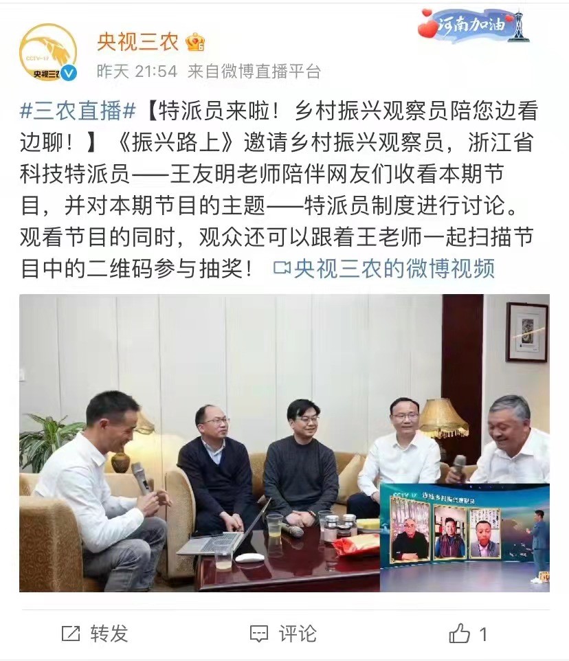 2021年12月5日晚9点-10点半,央视频《同频共振》空中连线浙江4位科技特派员直播节目,畅聊科技特派员的点点滴滴,希望让更多人了解科技特派员和他们服务地方的故事。作为该栏目唯一被邀请参与直播的科技特派员团队,食品与药学学院省科技特派员徐大伦老师作为主要成员全程参与了直播分享。