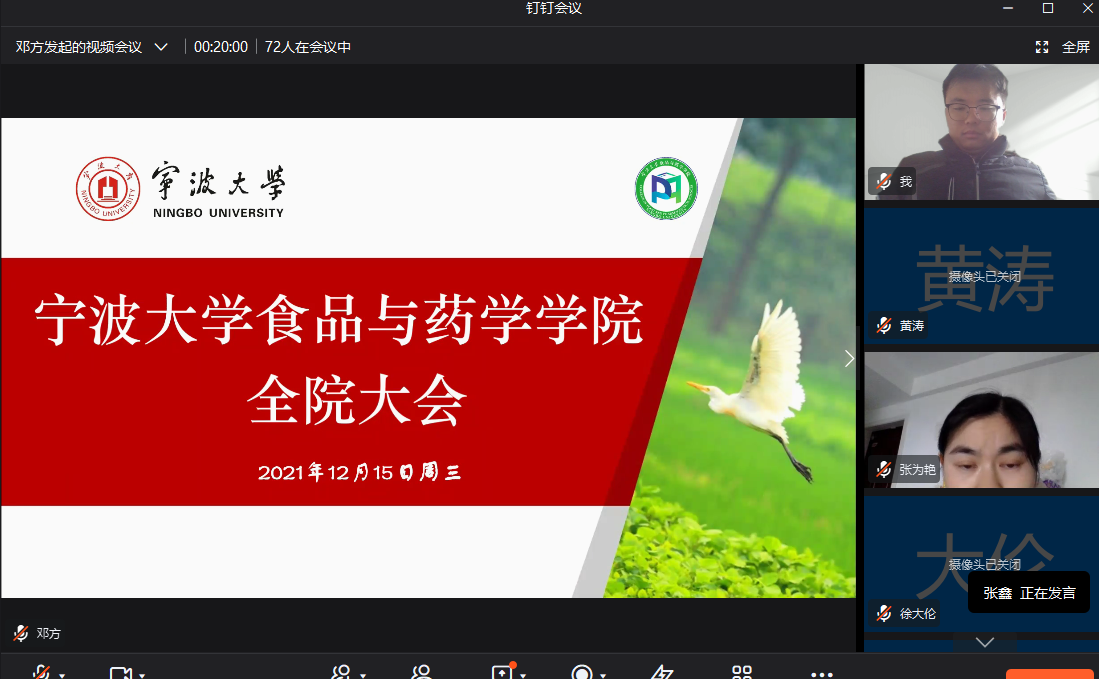 结合当前疫情防控形势的需要,为推动2021年末学院各项工作顺利开展, 12月15日,食品与药学学院采用钉钉平台召开全院教职工视频会议,会议由学院党委书记陶娟主持,学院72名教职工参加了此次大会。