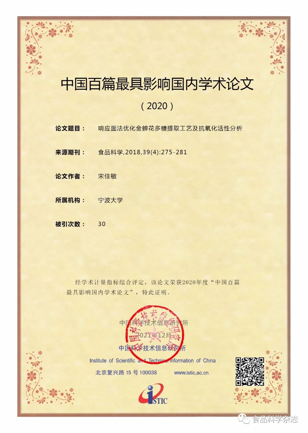 硕士研究生宋佳敏为第一作者,王鸿飞教授为通讯作者发表的“响应面法优化金蝉花多糖提取工艺及抗氧化活性分析”入选中国百篇最具影响国内学术论文(2020),论文于2018年发表于《食品科学》第39卷4期。