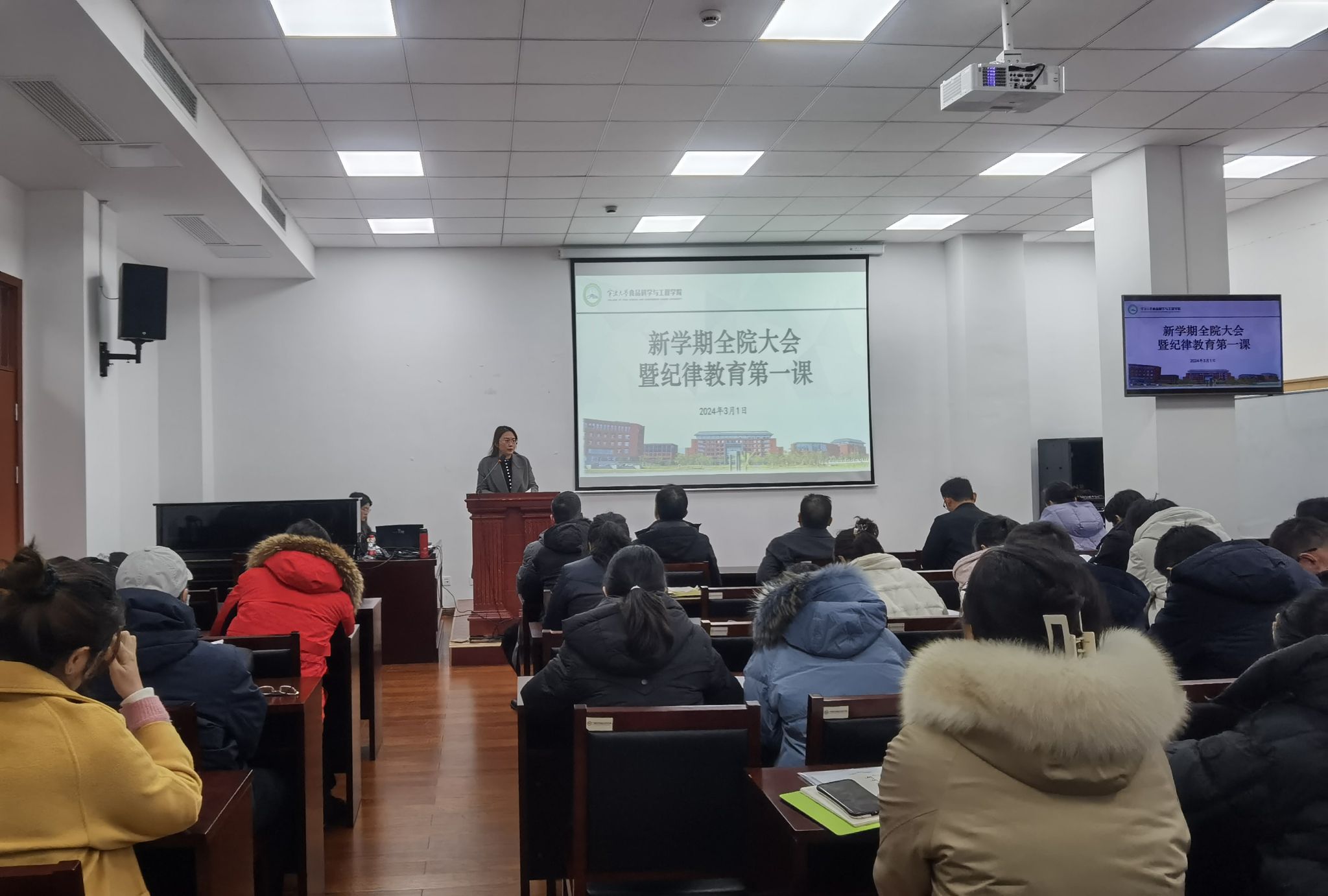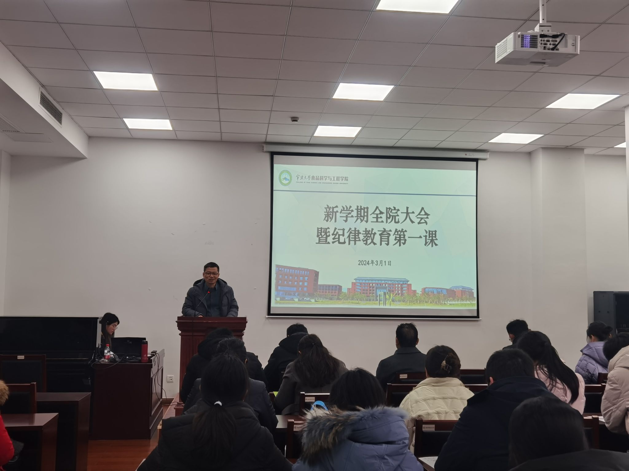 在梅山校区竺银康楼120会议室举行新学期全院大会暨纪律教育第一课,党委书记龚文杰主持会议。