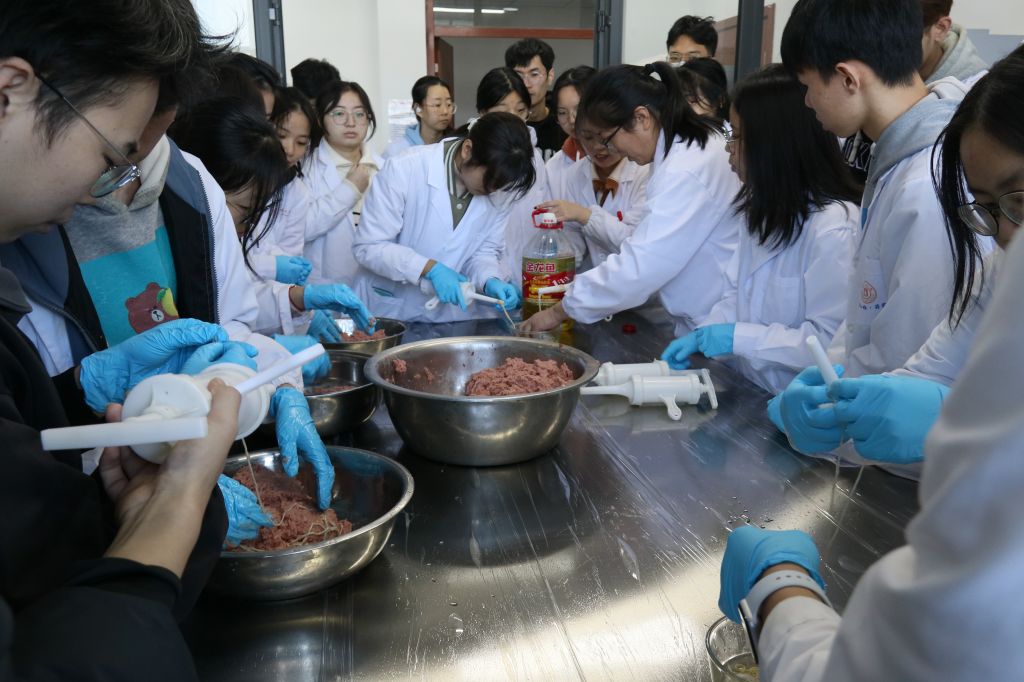 第一课堂上,专业老师孙杨赢为学生们详细介绍了肉肠制作的具体过程,深入解释了其中涉及到的实验原理。这一过程使学生们亲身感受到食品制作工艺的原理,打开了一扇通向专业知识深度理解的新大门,使他们更加深刻地理解与掌握专业知识。