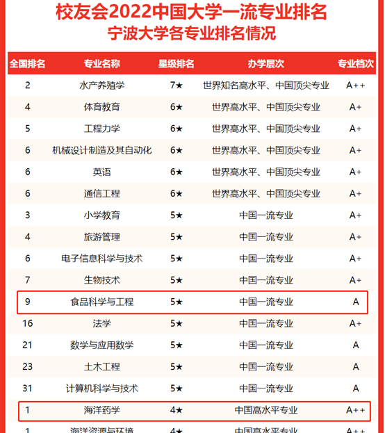 食品科学与工程专业在“食品科学与工程专业排名(研究型)”类别中被评为5星专业,专业档次为A;海洋药学专业在“海洋药学专业排名(研究型)”中被评为4星专业,专业档次为A++。此外,食品科学与工程专业在2022年邱均平百分位排名中稳步提升至全国11.43%,两本科专业排名大幅上升,体现了学院积极响应国家的教育发展战略,切实落实本科专业国家标准要求。学院将以此为契机,坚持以立德树人为根本,不断创新人才培养模式,持续提升专业建设水平,实现高等教育内涵式发展。