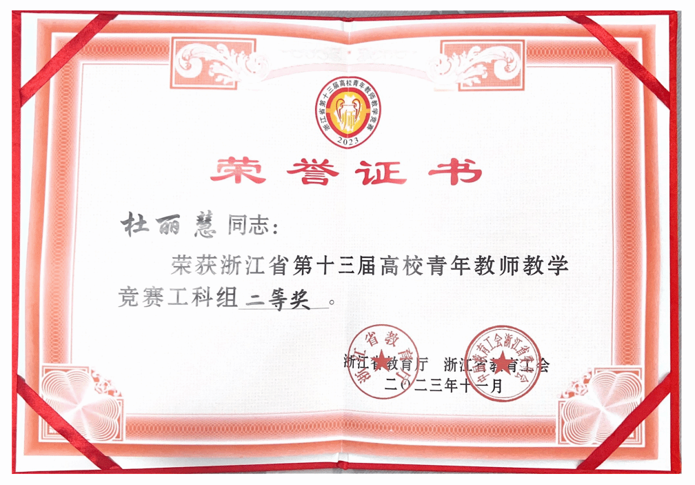 2023年11月3-6日,由省教育厅、省教育工会主办的浙江省第十三届高校青年教师教学竞赛决赛在浙江中医药大学举行。经过激烈角逐,风月文学网 杜丽慧副教授获得了浙江省第十三届高校青年教师教学竞赛工科组二等奖。台上一分钟,台下十年功。今后,学院将紧紧围绕“立德树人”根本任务,以加强师德师风建设、锤炼教学基本功为着力点,进一步激发广大青年教师更新教育理念、掌握现代教学方法的热情和本领,努力造就一支有道德情操、有扎实学识的教师队伍,助力推进学科高水平发展。