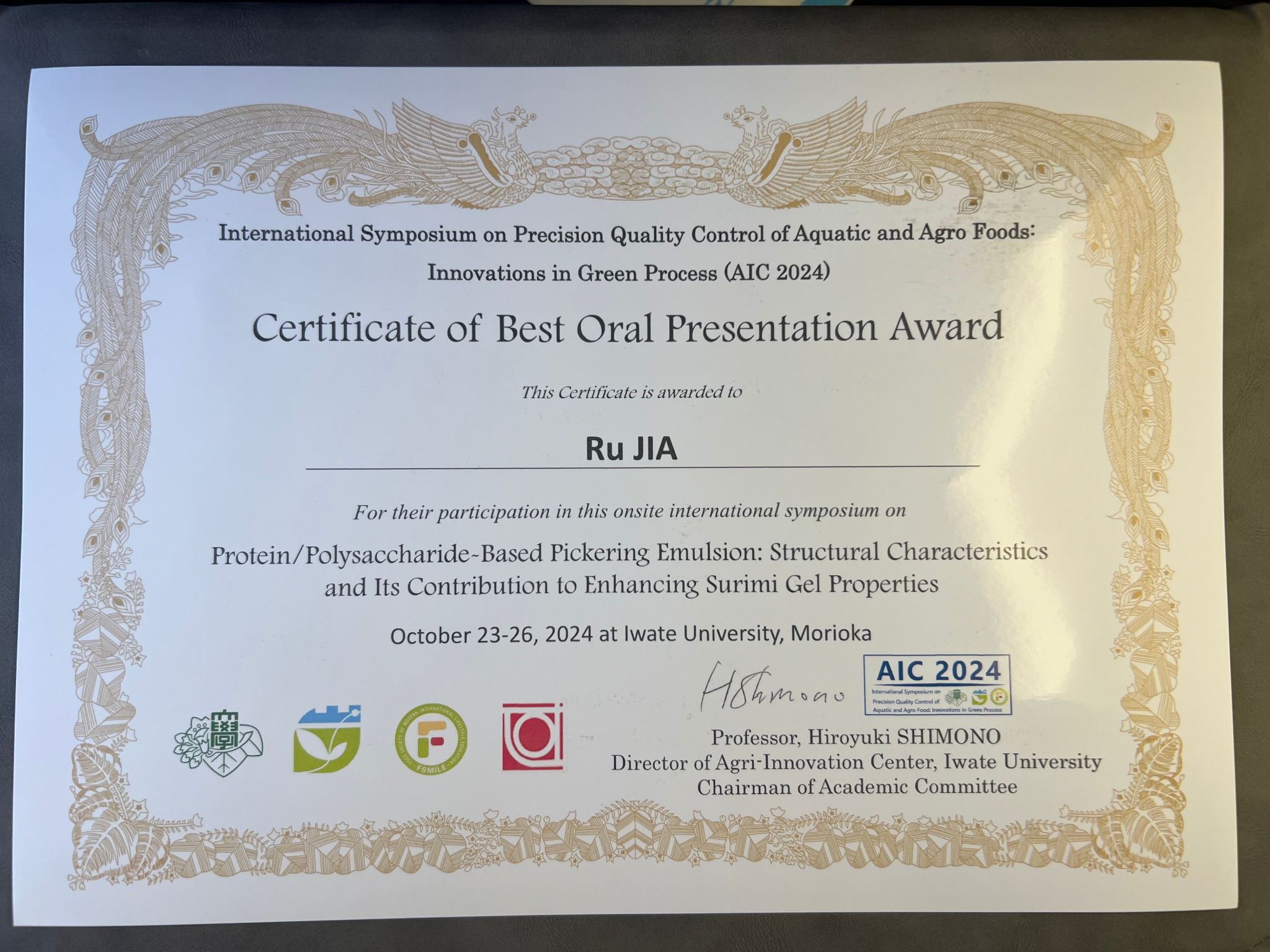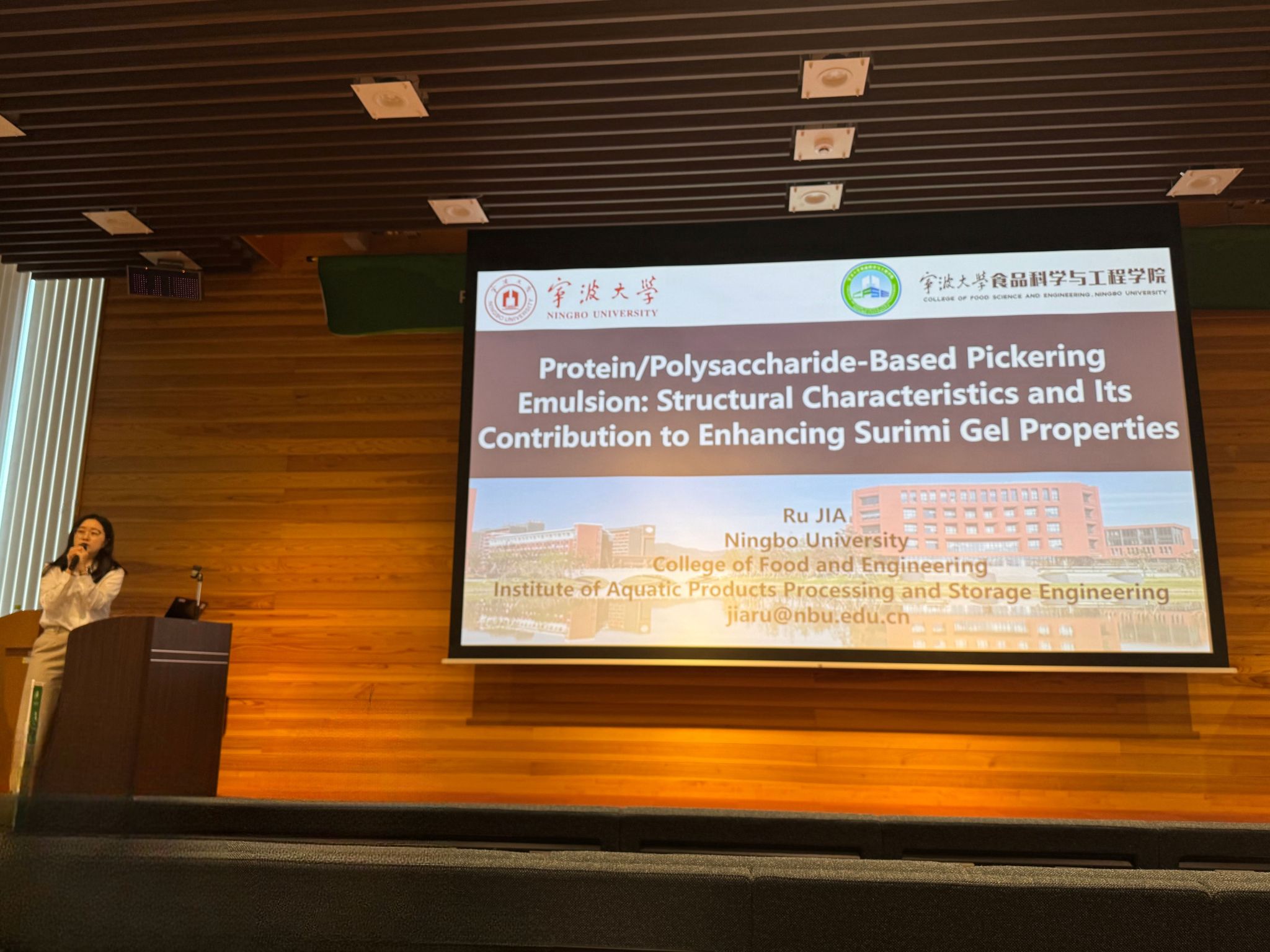 在会议上,魏华茂副研究员作为本次会议的特邀嘉宾,发表了关于虾及虾干制品嫩化技术的主题报告,并深入剖析了老年食品中虾制品开发的最新成果与广泛应用前景。贾茹副教授与李高尚博士也分别带来了关于Pickering在鱼糜制品中的创新应用,以及3D打印钙离子-纳米淀粉-叶黄素-鱼糜的消化特性、抗氧化性、跨膜吸收转运特性的变化及其机制探究。经大会评审,贾茹副教授与李高尚博士双双荣获“Best Oral Presentation Award”。