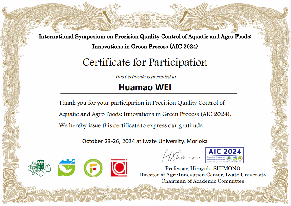贾茹副教授、魏华茂副研究员及李高尚博士携2位研究生蒋秀艺、刘襄瑶赴日参加“International Symposium on Precision Quality Control of Aquatic and Agro Foods: Innovations in Green Process (AIC2024)”,此次会议由日本农业创新中心(AIC)及岩手大学主办,汇聚了来自中国、日本、韩国、美国及欧洲等10个国家的120余名科研工作者,介绍和讨论了有关食品系统质量控制和可持续性发展的最新科学进步和技术成果。