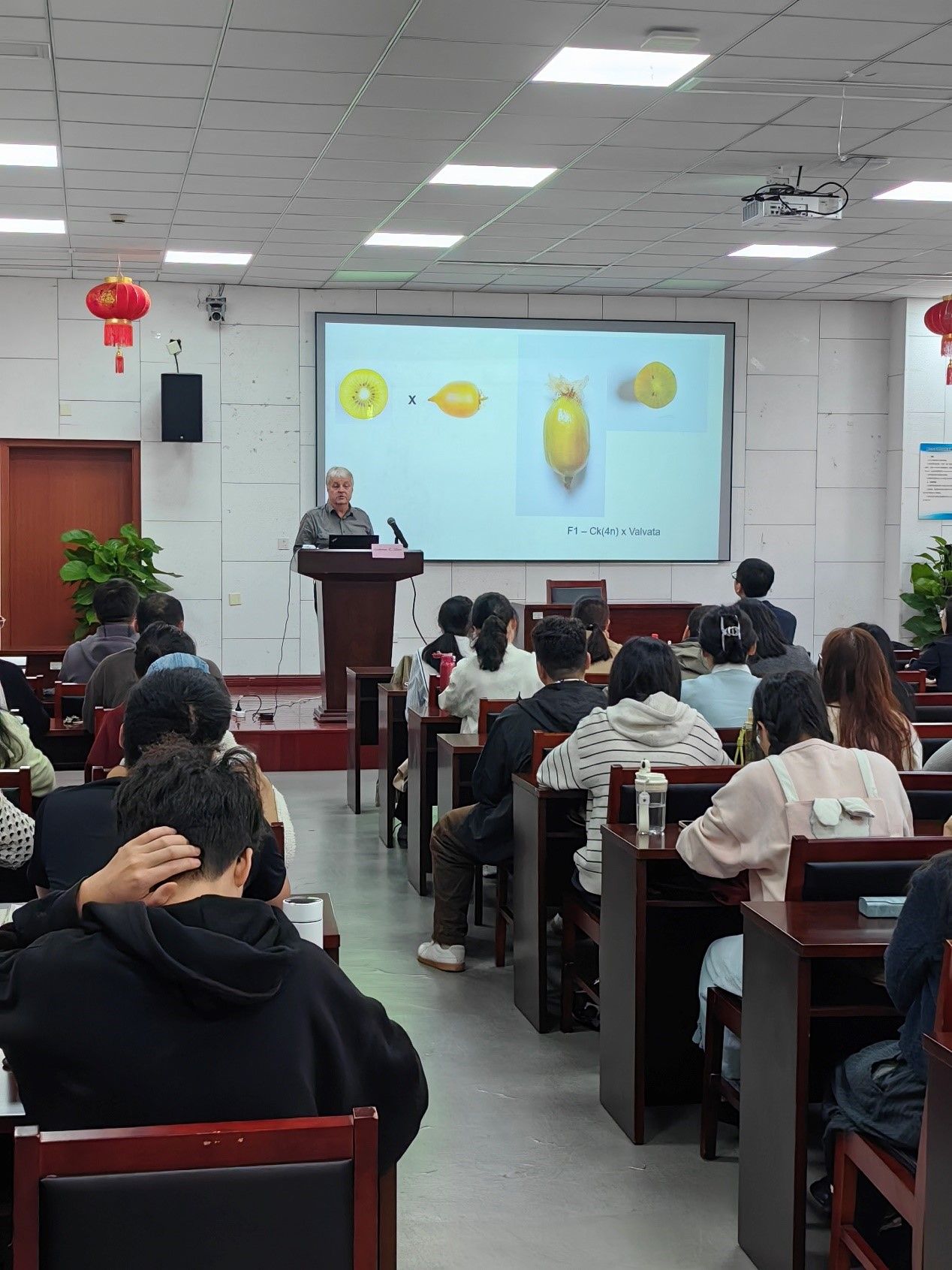 Andrew C. Allan教授详细介绍了其所在团队近年来在水果品质改良方面的最新研究成果。首先,他解析了红肉苹果果肉积累花青苷的分子机制,并利用基因工程育种技术获得了第一例红肉转基因苹果。接着系统介绍了猕猴桃果实的叶绿素、类胡萝卜素和花青苷的积累调控研究,并分享了利用基因工程技术对苹果、猕猴桃等常见水果进行品种改良的案例。他强调,通过精确的基因操作,可以显著提高水果的营养价值、口感以及贮藏性能。在交流环节,师生们提出了许多关于基因工程技术在食品安全和伦理方面的问题,Allan教授一一耐心解答,并分享了国际上这一领域的最新动态和趋势。