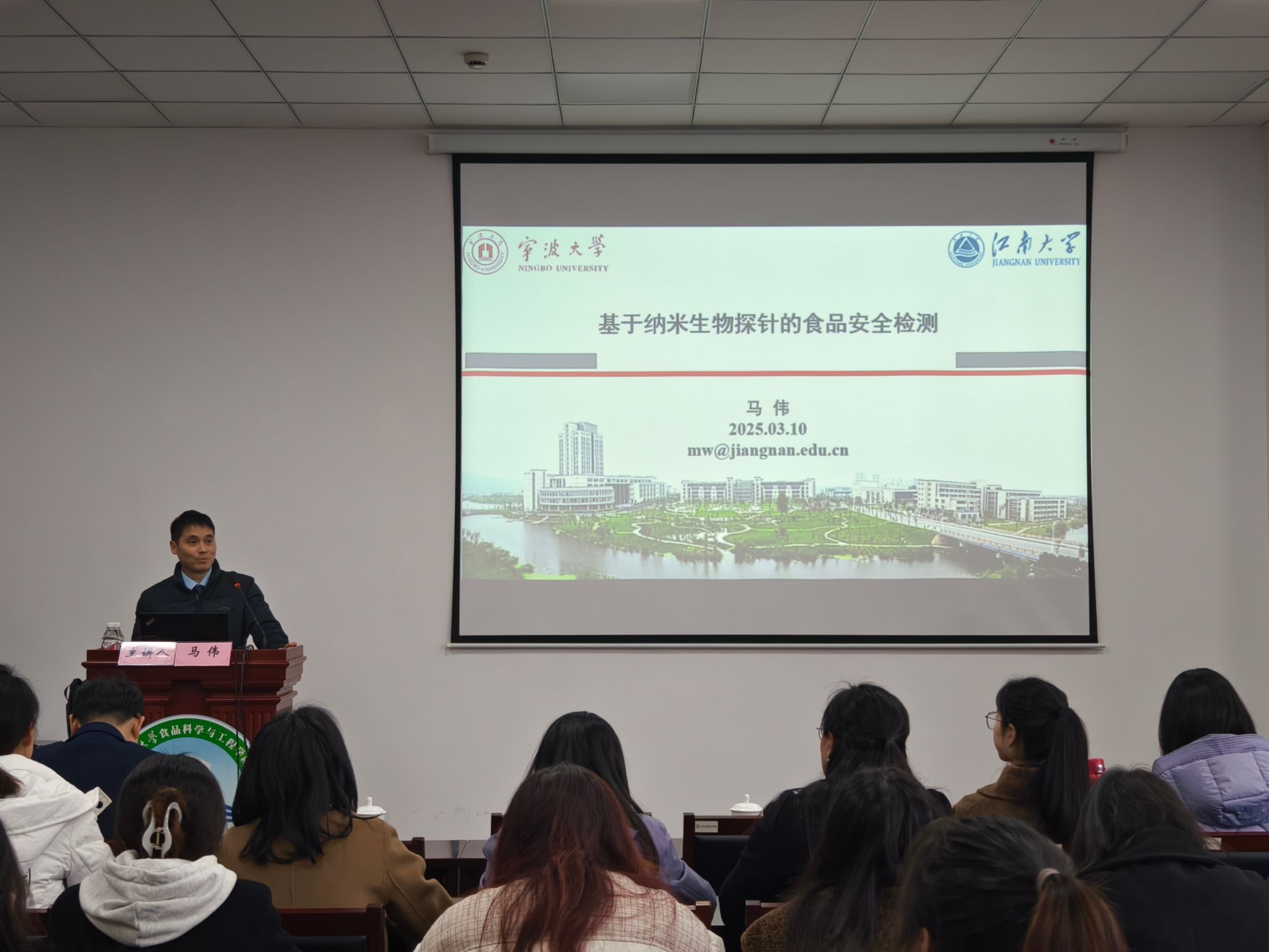 指导并作了题为《基于纳米生物探针的食品安全检测》的学术讲座。学院执行院长邵兴锋主持讲座,学院教师和研究生共70余人参加了此次讲座。