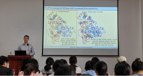 Lukasz Peplowski教授以酶工程中的分子建模的物理背景及其相关理论知识为开篇,深入阐述分子建模工具可以帮助设计更高效的酶或表现出新特性的酶,向学院师生详细解释如何设计具有区域选择性和立体选择性的酶,如何设计具有更高热稳定性的酶,并进一步说明促进热稳定性增加的分子机制以及介绍设计具有增强催化活性的酶的理论方法。