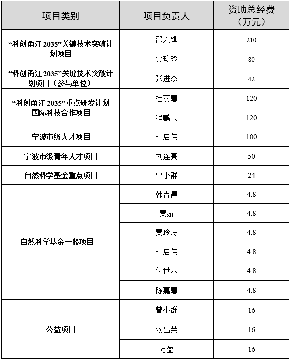 获批宁波市“科创甬江2035”关键技术突破计划项目2项,参与1项;获批宁波市“科创甬江2035”重点研发计划国际科技合作项目2项;获批宁波市级人才项目1项;获批宁波市级青年人才项目1项;获批宁波市自然基金重点项目1项、一般项目6项;获批宁波市公益项目3项。总经费预计达822.8万元。