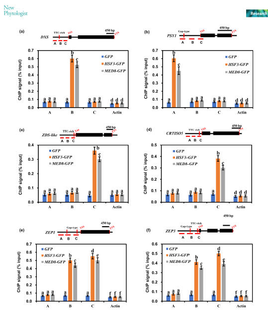 研究团队通过反向遗传学的方法,鉴定出了med8突变体,其表现为岩藻黄素含量降低;利用基因表达、蛋白质亚细胞定位、蛋白质相互作用和染色质免疫共沉淀等方法,对MED8在岩藻黄素合成中的生物学功能进行了深入研究。研究发现,通过基因编辑技术产生的med8突变体不仅使岩藻黄素含量降低,而且与野生型藻株相比,岩藻黄素合成的六个关键基因(DXS、PSY1、ZDS-like、CRTISO5、ZEP1和ZEP3)的表达水平也降低。此外,研究还发现MED8与HSF3相互作用,并通过遗传分析揭示了它们可共同调控岩藻黄素的合成。另外,研究还发现HSF3对MED8与这六个岩藻黄素合成基因的启动子结合起到了重要作用。总之,MED8和HSF3通过调控岩藻黄素合成基因的表达参与了岩藻黄素的合成过程。这一研究结果有助于我们对海洋微藻中岩藻黄素合成分子调控机制的理解。