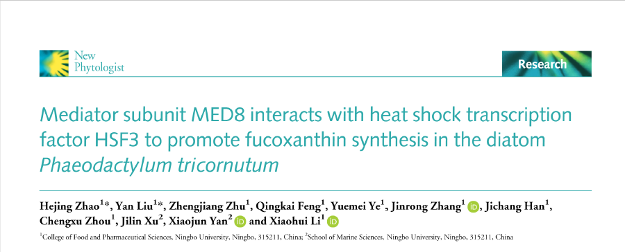 微藻未来食品营养与健康团队在国际植物学顶级期刊New Phytologist(SCI一区,TOP)上发表题目为“Mediator subunit MED8 interacts with heat shock transcription factor HSF3 to promote fucoxanthin synthesis in the diatom Phaeodactylum tricornutum”的研究论文。