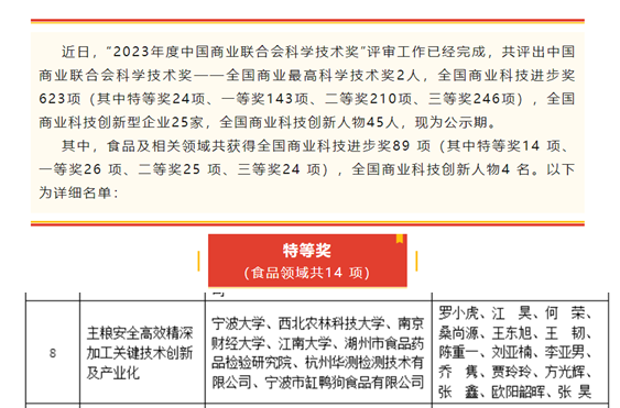 作为第一完成单位申报的《主粮安全高效精深加工关键技术创新及产业化》成果荣获中国商业联合会科学技术奖特等奖。该成果就全球共同面临的主粮安全加工技术与副产物综合利用领域,如何科学解决一系列重大挑战和技术难题提出了中国策略和解决方案。