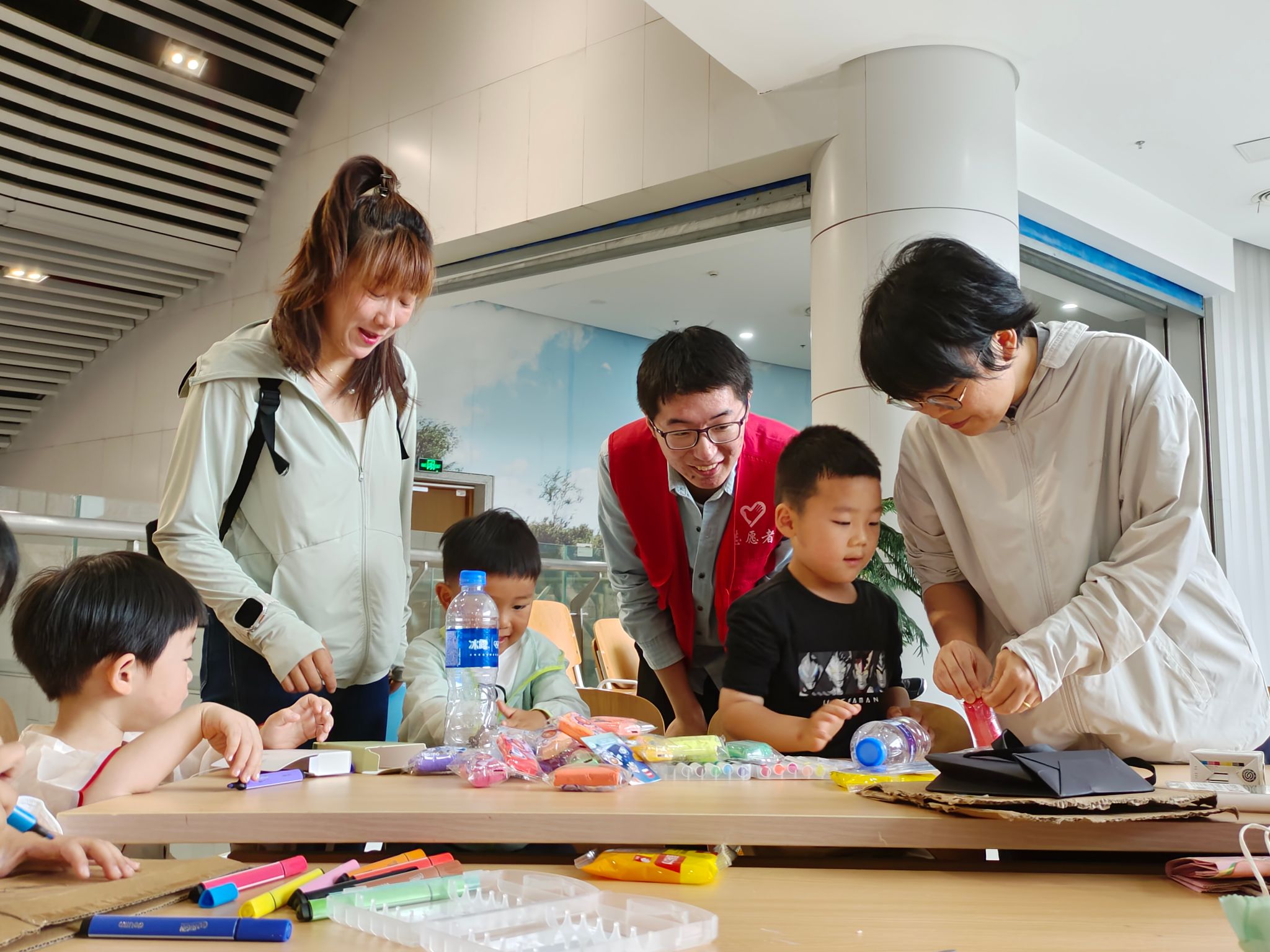 随后,志愿者们拿出黏土、水彩笔、空瓶、纸袋等,指导现场儿童DIY制作专属手工作品,孩子们的小手将“垃圾”变废为宝。“哇,你做得可真好看!”“你的手真巧啊!”志愿者们一边送出一份份小奖品鼓励着大家,一边耐心倾听他们讲述着自己手工作品的创作内涵。在场的孩子和家长们都不由得露出了喜悦的笑容,孩子们高高举起自己的小作品拍照留念,活动现场洋溢着欢乐的氛围。