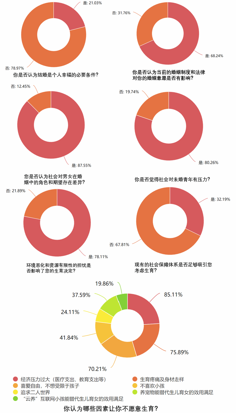根据调研结果分析得出,当代年轻人应当以更加开放和理性的态度,去审视婚姻与生育的意义。在本次社会实践中,调研团从一个个访谈与数据图中看到了青年学生们对于婚育观念的多元理解与包容心态。