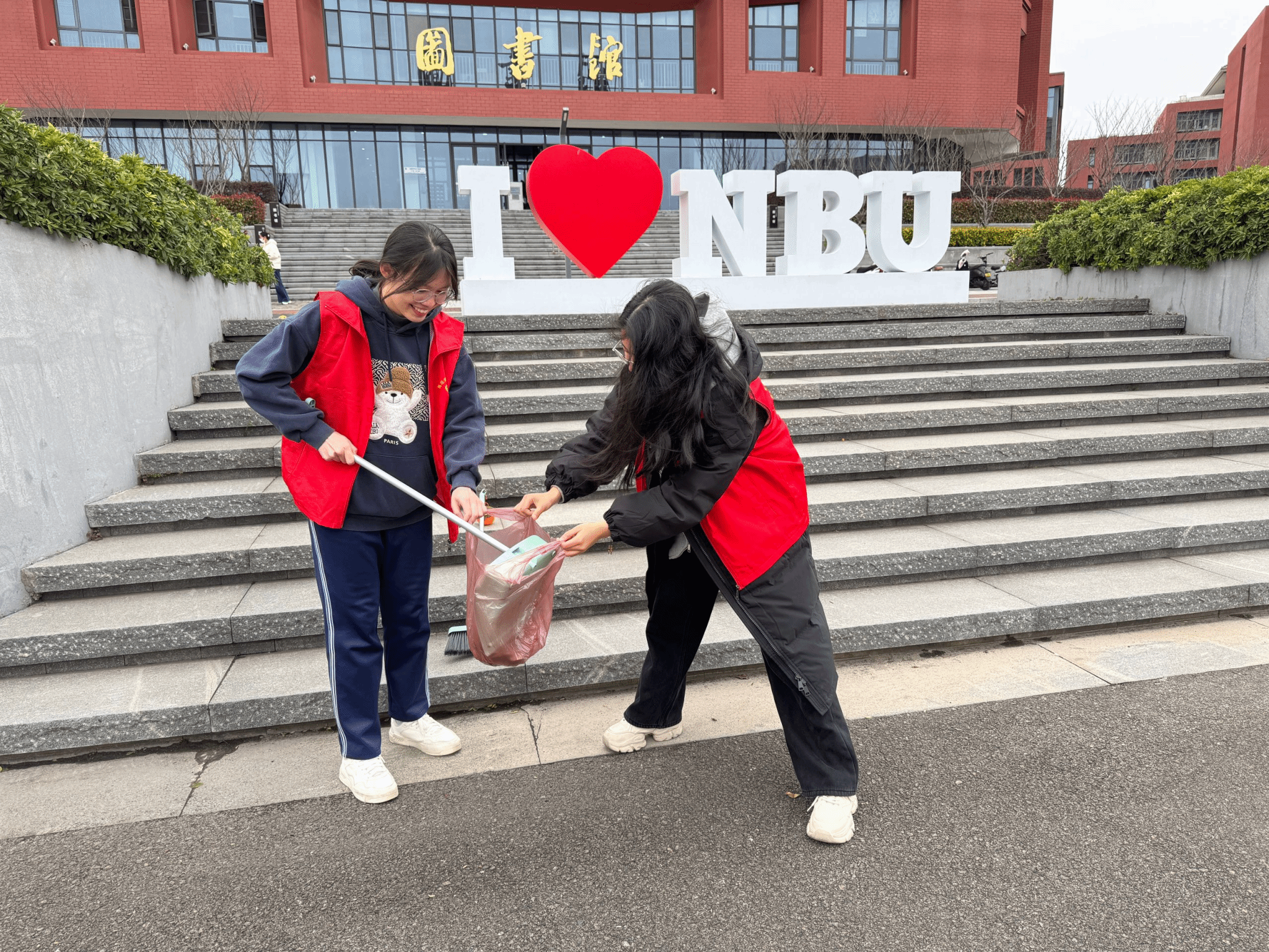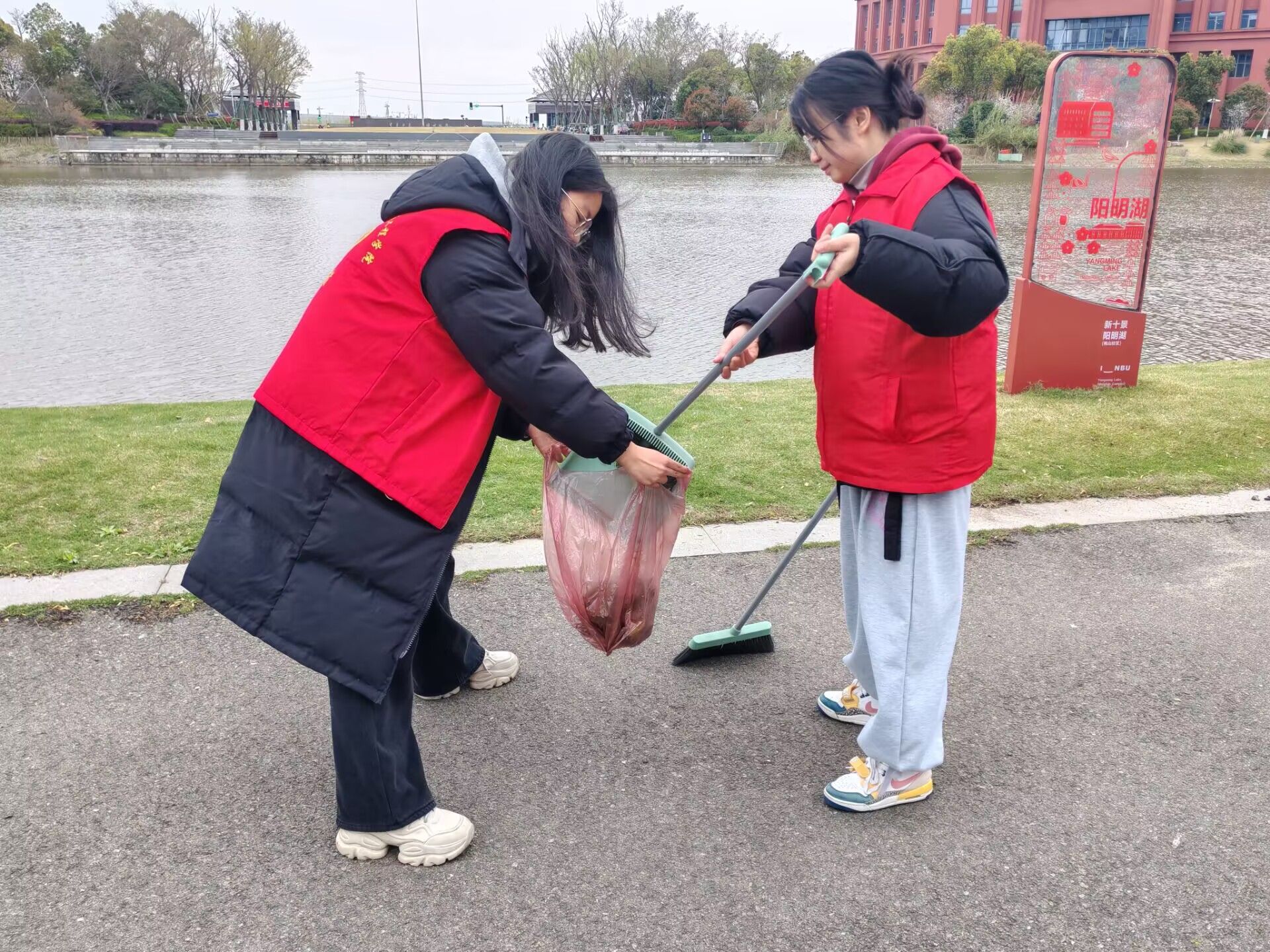 活动当天,志愿者们身着统一服装,手持清洁工具,分组对校园内的主干道、绿化带、教学楼周边等重点区域进行全面清理。大家分工协作,细致捡拾纸屑、落叶、塑料瓶等垃圾,并对公共区域卫生死角进行了重点清扫。身着红色马甲的志愿者队伍成为春日校园里的流动风景线,他们的辛勤劳动也让校园环境焕然一新。