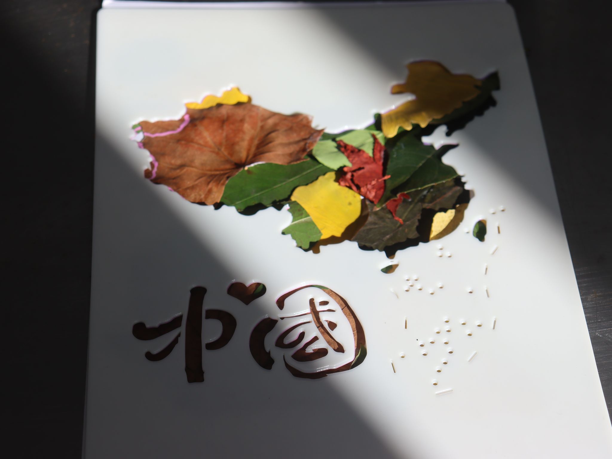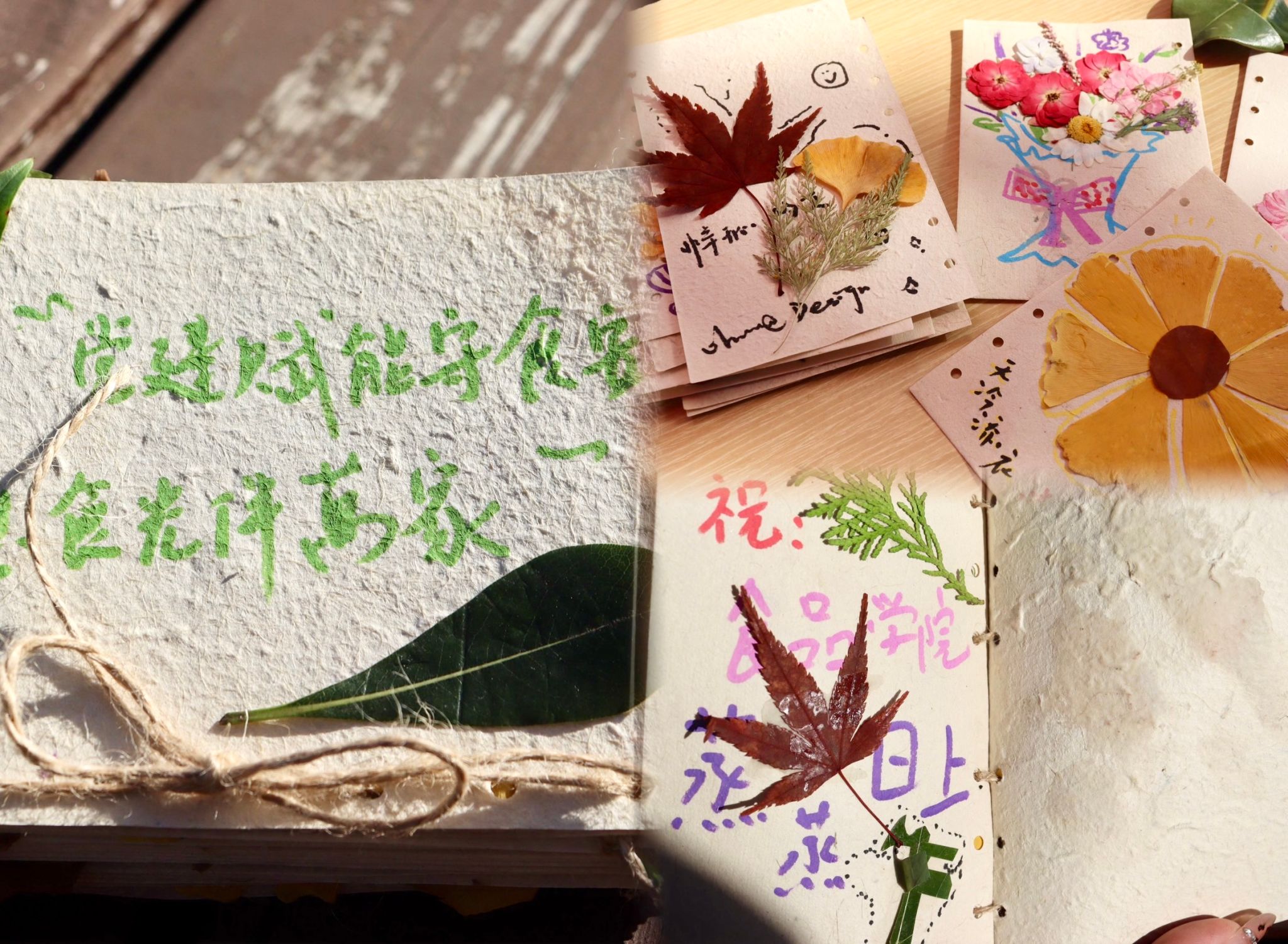 随着烘焙成品陆续冷却装盘,“叶抒红心・冬日暖情”主题互动同步启动,一片片落叶成为同学们传递心意、抒发情怀的独特载体,有同学细心比对不同树叶的形状,拼贴出轮廓清晰的中国地图,让爱国热忱在错落的叶脉间自然流淌;有同学用棉线将小巧的树叶串成精致项链,在打结固定的细节里倾注着温暖的情谊;还有同学以树叶为装饰创作专属手帐,记录当下的心境和对未来的期许。