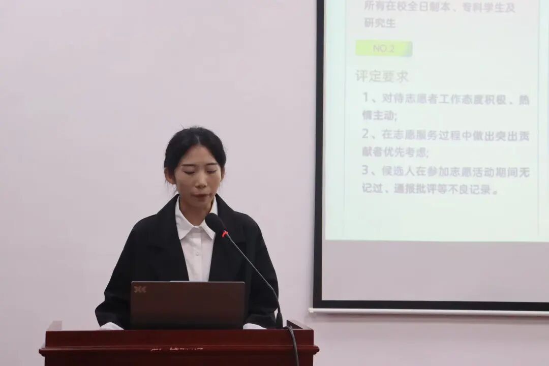 在激励与表彰方面,办公室杨呈妍同学介绍了“星级志愿者”、“十佳青年志愿者”等个人荣誉,以及“青年志愿者服务杰出集体奖”的评选标准,为个人成长与团队建设指明了努力方向。
