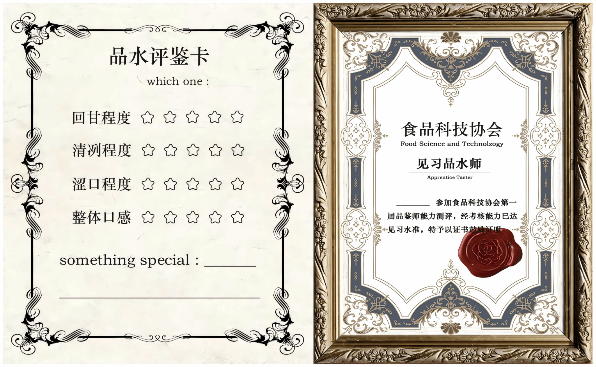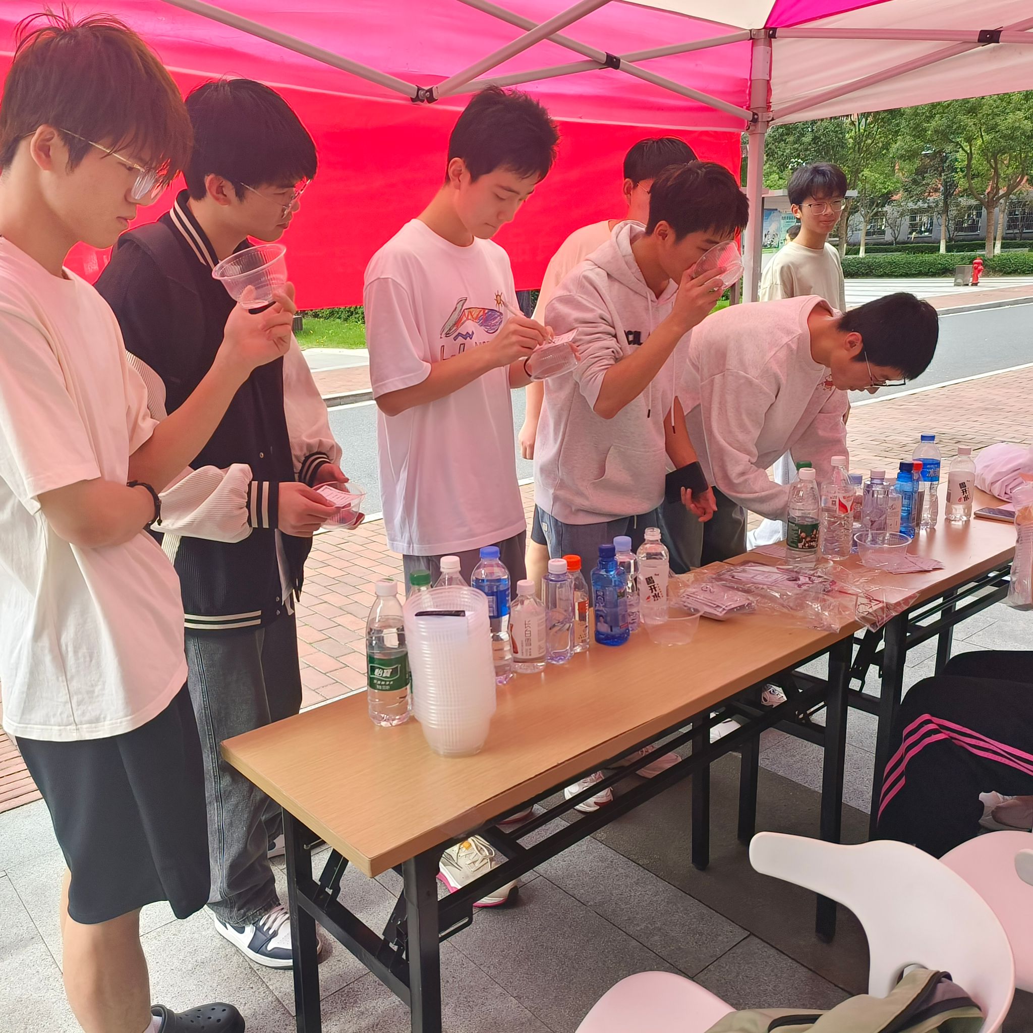 除品尝环节外,食协还设置了有趣的“猜一猜”小游戏。由摆摊人员随机倒一种矿泉水,同学们品尝后需要猜出这杯水的品牌,猜对的同学可以领取由食品科技协会精心制作的品鉴师等级证书一份。这不仅让同学们有了一次特别的体验,也让他们对自己的品鉴能力有了更清晰的认知
