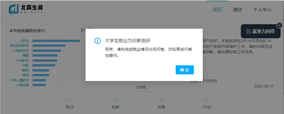 2. 登录成功后,将自动弹出“大学生就业力诊断”窗口,点击确定后进入。