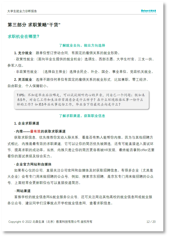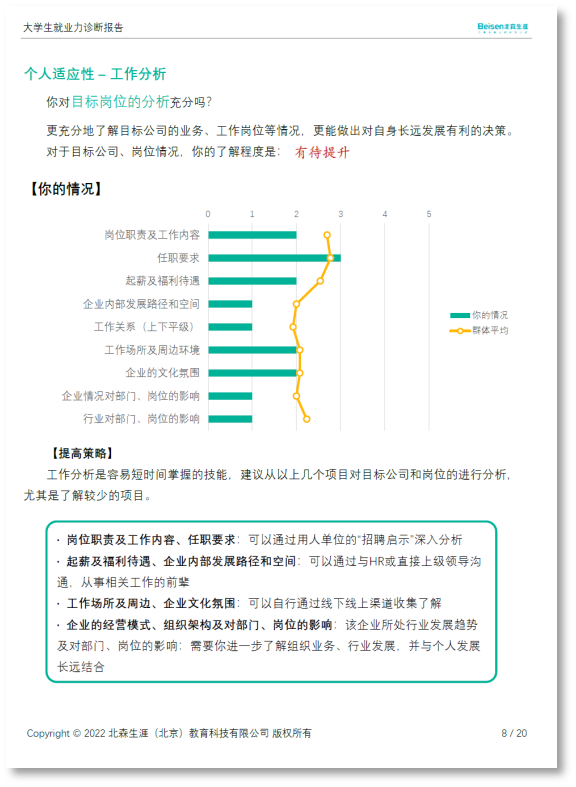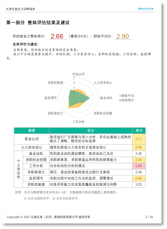 “就业力诊断”是通过学生线上答题的方式,对职业认同、人力资本和个人适应性等就业力构成要素进行诊断,通过诊断,为每一位参与调查的学生提供一份个人报告,帮助学生了解自身在求职各方面、各阶段的准备程度,促进思考与行动,并了解求职策略“干货”,提升学生岗位搜寻、渠道利用与机会获得的效率效果。