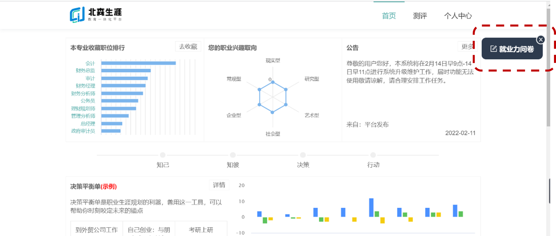 为帮助大家了解自身在求职上的准备程度,以终为始、前置准备,提升机会搜寻、渠道利用与机会获得的效率效果,面向我校全体2023届毕业生开展就业力诊断工作。现将相关系统使用说明介绍如下:
